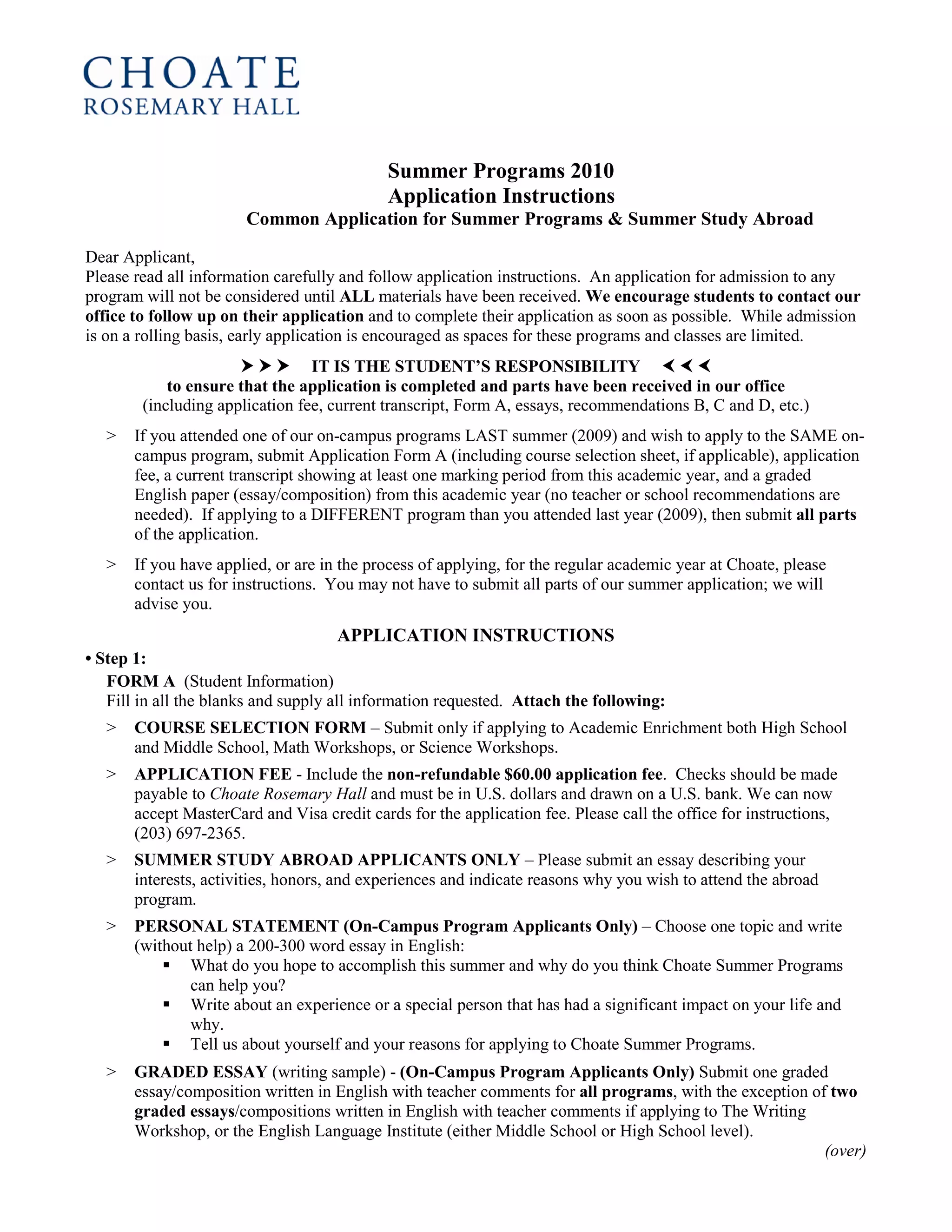 The document provides instructions for applying to Choate Rosemary Hall's summer programs in 2010. It outlines the application process in 4 steps: [1] completing application Form A and attaching required documents; [2] obtaining a school recommendation on Form B along with a transcript; [3] obtaining an English teacher recommendation on Form C; and [4] obtaining an additional teacher recommendation on Form D. It notes various deadlines and requirements depending on the specific summer program being applied to.