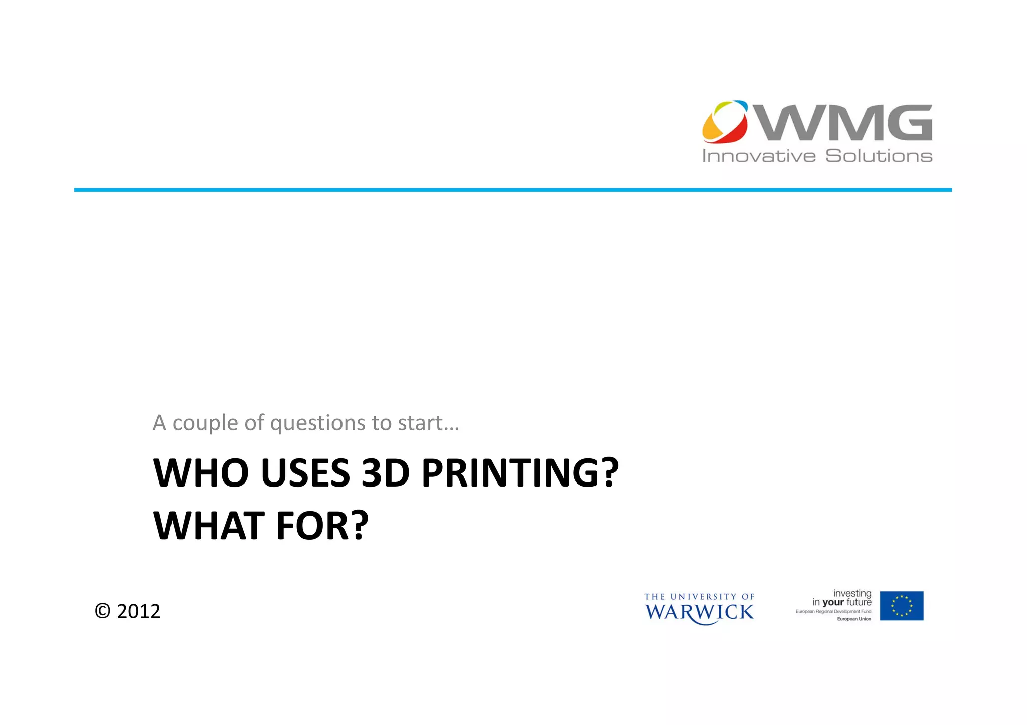 The document discusses various applications of 3D printing including architecture, marketing, medicine, furniture, fashion, animation, and small-medium enterprises. It then details the 3D printing capabilities at IIPSI including fused deposition modeling (FDM), multi-jet modeling (MJM), laser sintering, and electron beam melting. Research activities exploring metallic and composite 3D printing, high resolution hybrid deposition, medical modeling, and low cost 3D printing are also summarized.