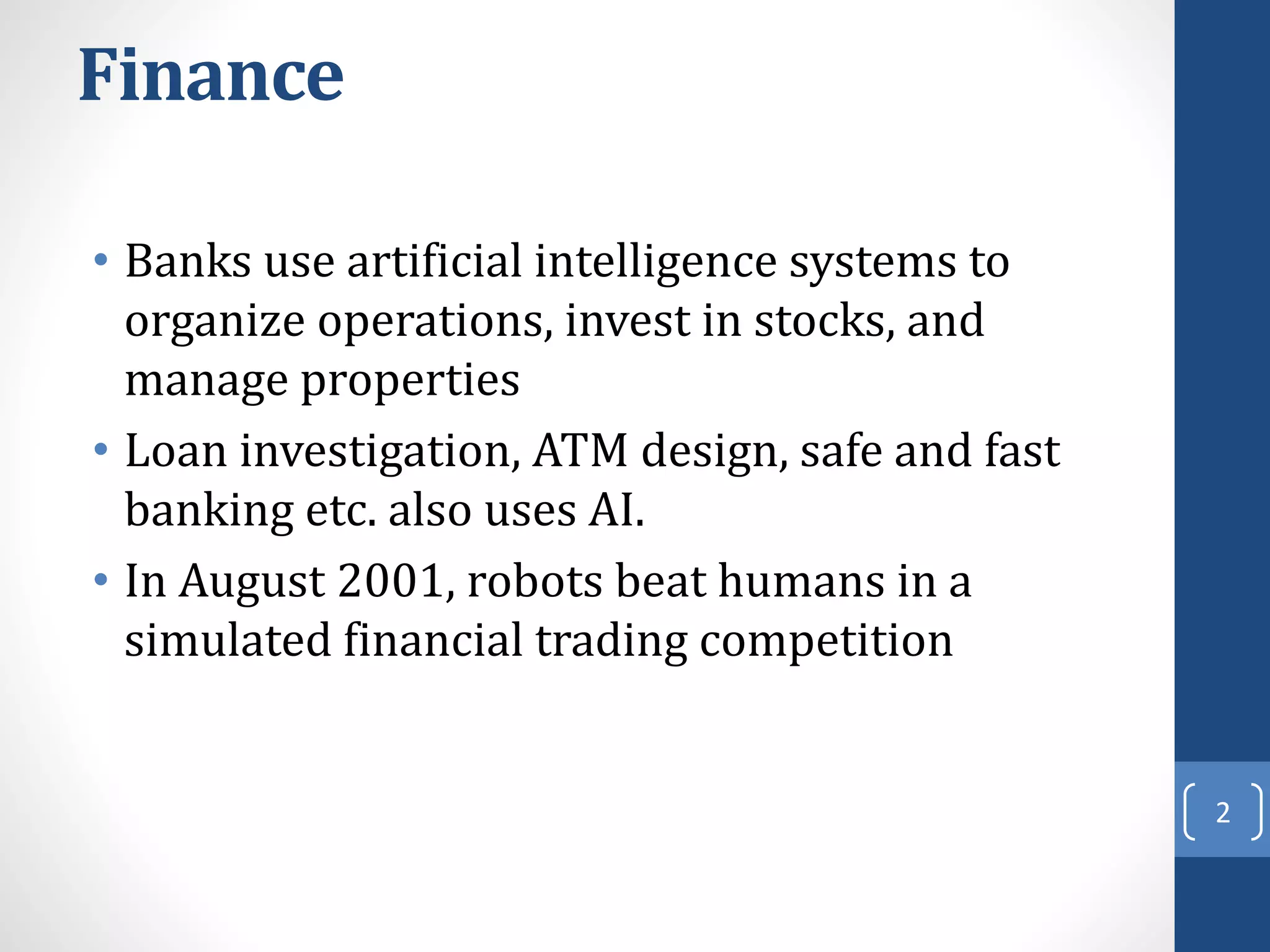 Artificial intelligence is applied in many domains including finance, hospitals, heavy industry, telecommunications, gaming, music, and antivirus software. In finance, AI is used for operations, investing, loan investigations and ATM design. In hospitals, AI organizes bed schedules, staff rotation, and provides medical information. Robots are effectively used in heavy industry for dangerous, repetitive, or degrading jobs. Telecommunications companies use AI for workforce scheduling. AI is also applied to video games through bots and to music composition, performance, and sound processing. Antivirus detection has increasingly integrated AI techniques to improve performance.