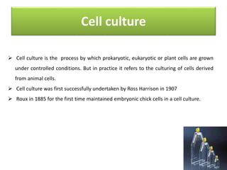 The document discusses the applications of cell cultures and cell lines in biotechnology, highlighting their importance in cancer research, drug testing, and vaccine production. It explains various types of cell cultures, including primary and continuous cell lines, along with the laboratory equipment and media used in cell culture processes. Emphasis is placed on the advancements in cell line technology for producing vaccines, antibodies, and recombinant proteins, as well as their role in therapeutic interventions and drug development.