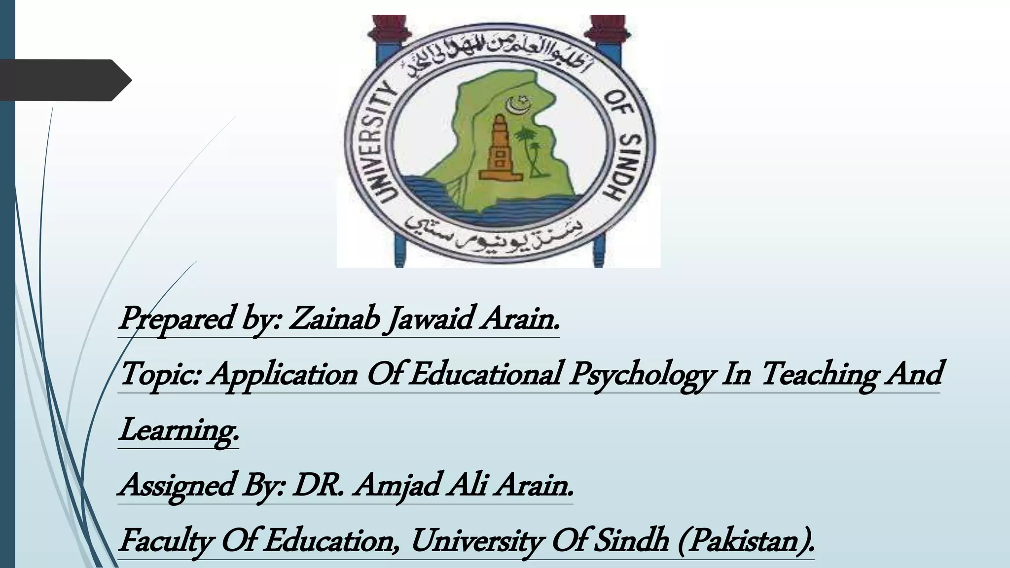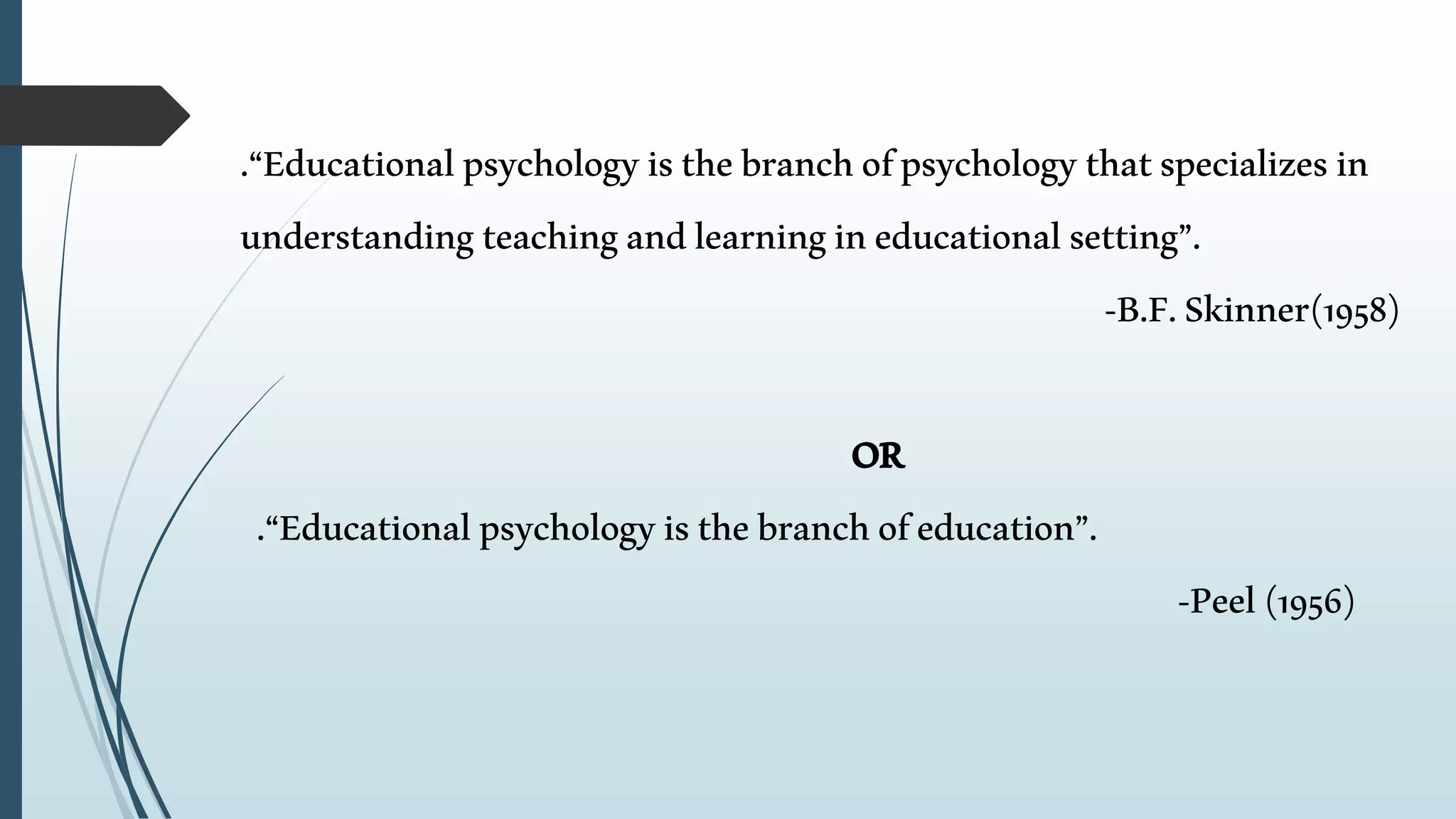 This document discusses the application of educational psychology in teaching and learning. It defines educational psychology as the branch of psychology that focuses on understanding the processes of teaching and learning in educational settings. It explains that teaching and learning are closely related and can be divided into three levels: the memory level involving thoughtless teaching, the understanding level involving thoughtful teaching, and the reflective level involving the most thoughtful teaching requiring higher cognitive abilities. The document also lists several ways educational psychology can be applied by teachers, such as knowing the learner, providing guidance and counseling, using proper teaching methods, and improving communication skills. Finally, it provides brief descriptions of some influential psychologists who contributed to the field of educational psychology.