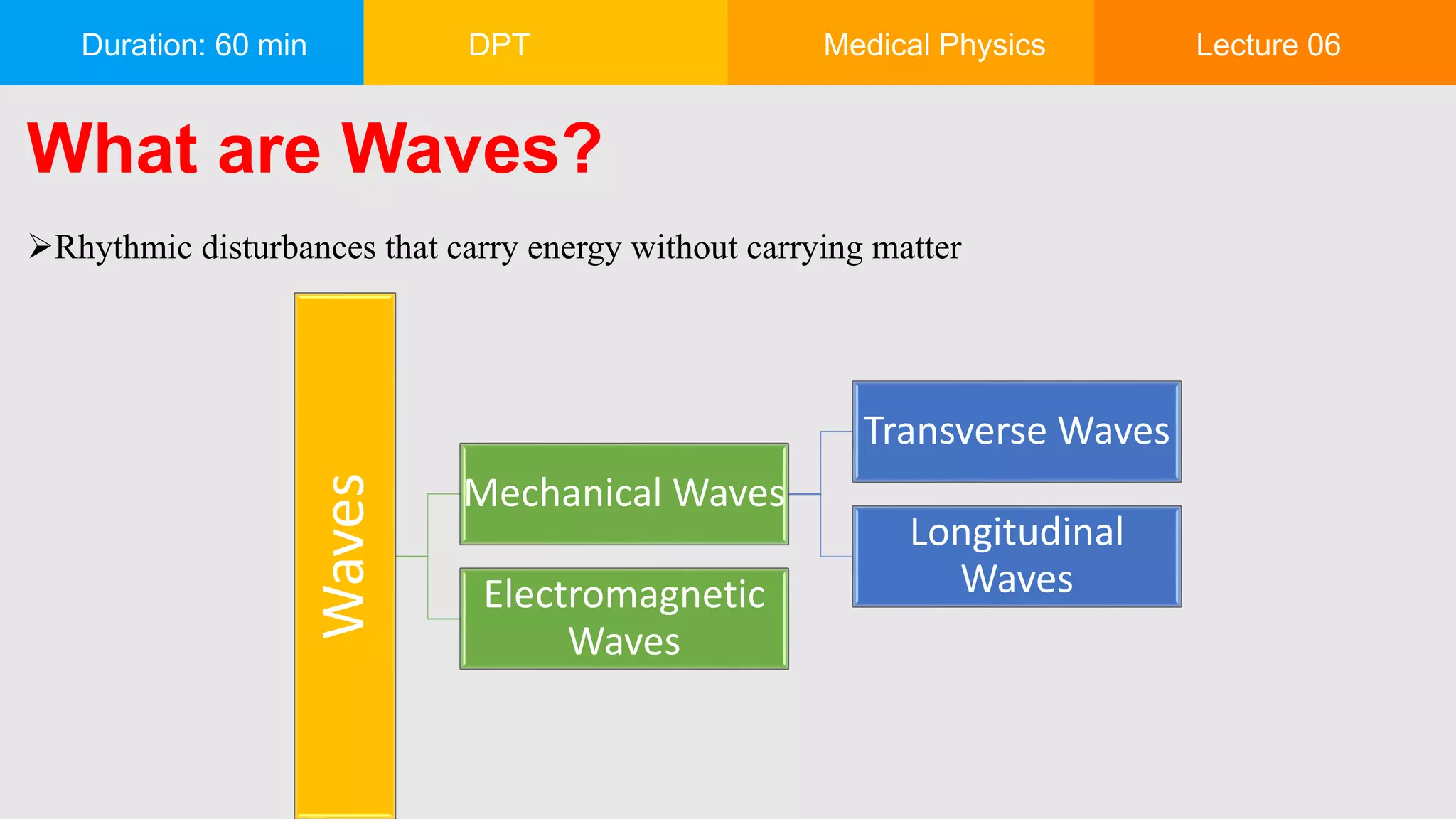 The document outlines a 60-minute lecture on the applications of electromagnetic (EM) waves in medical physics, highlighting concepts such as wave types, characteristics, and the use of x-rays and laser technology in medical diagnostics and treatment. It details the components and functions of x-ray machines, their medical applications, and the basics of laser therapy, including its advantages and disadvantages. The instructor encourages questions via email and provides a link for downloadable lecture content.
