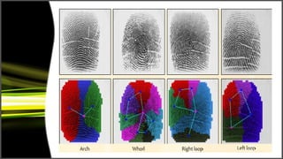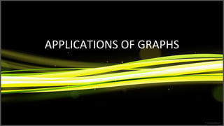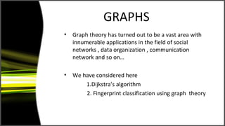 Graph theory has many applications including social networks, data organization, and communication networks. The document discusses Dijkstra's algorithm for finding the shortest path between nodes in a graph and its application to finding shortest routes between cities. It also discusses using graph representations for fingerprint classification, where fingerprints are modeled as graphs with nodes for fingerprint regions and edges between adjacent regions. Fingerprints are classified based on the structure of these graphs and compared to model graphs for matching.
