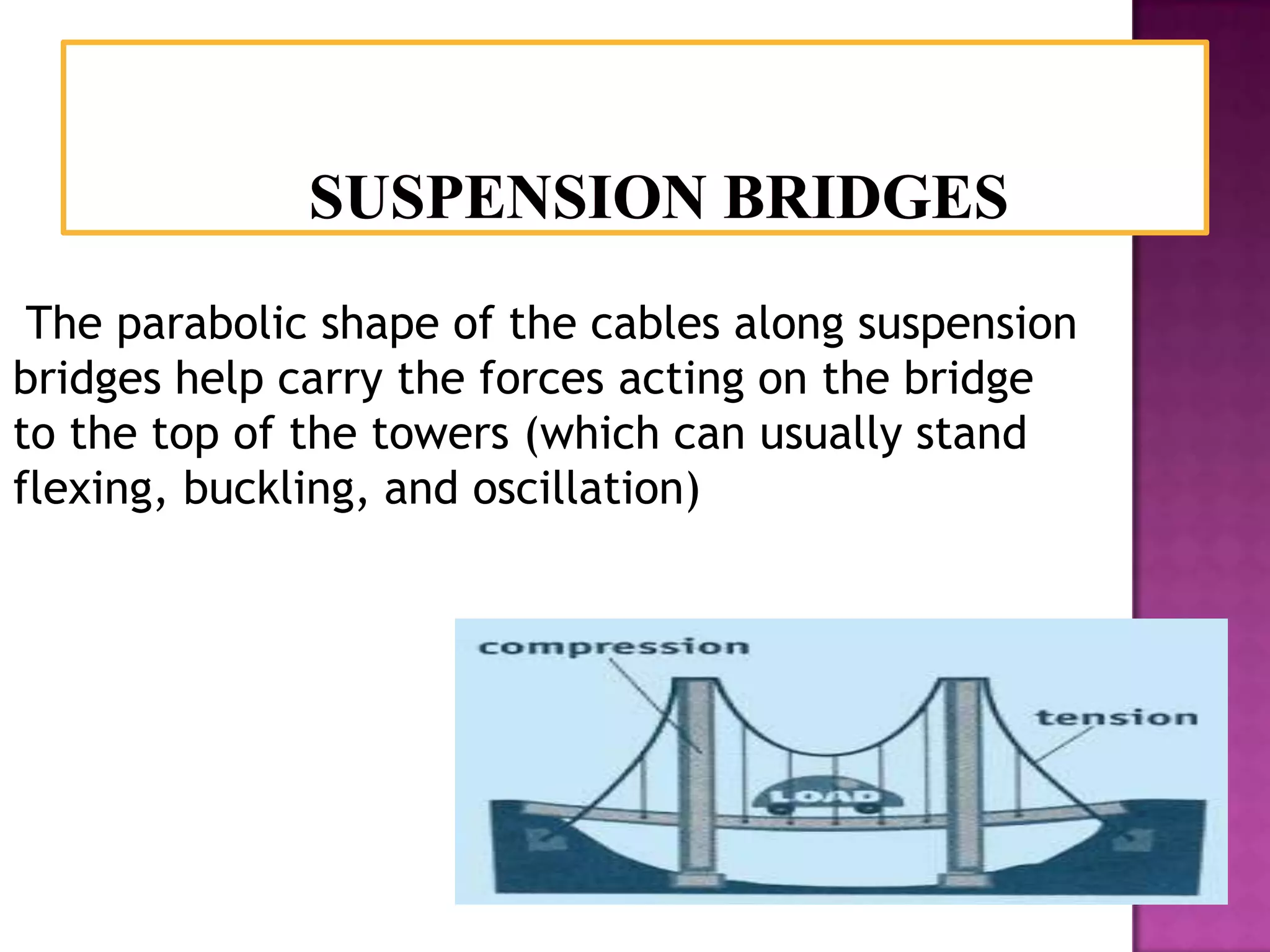 The document discusses how parabolic shapes help carry forces in suspension bridges by distributing them to the towers. It also explains how parabolic motion occurs due to gravity, with Galileo discovering that all thrown objects follow a parabolic path. Finally, it notes that parabolic reflectors can concentrate heat or sound by reflecting parallel rays to a focus.