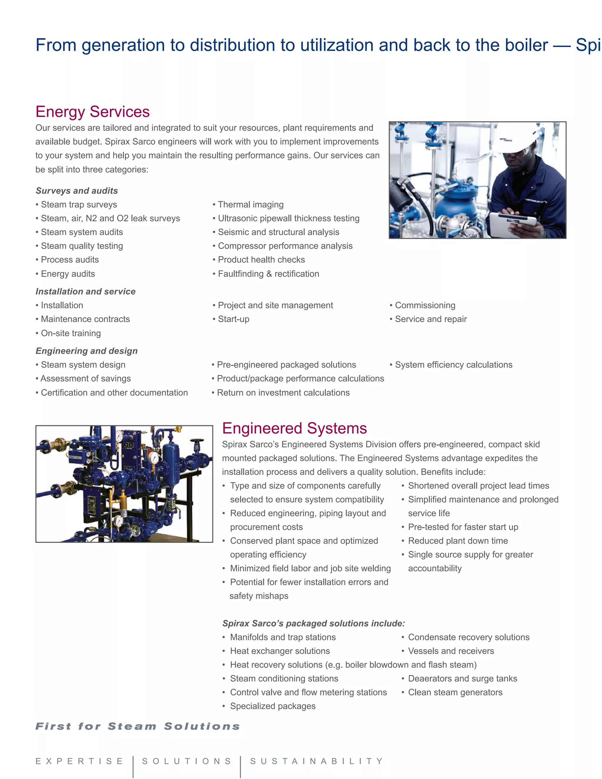 Spirax Sarco provides steam system solutions and services including surveys, audits, installation, engineering, packaged solutions, controls, steam traps, condensate pumps, high purity products, pipeline ancillaries, and training. Their services help improve steam system efficiency, productivity, and safety through solutions tailored to customer needs and budgets.