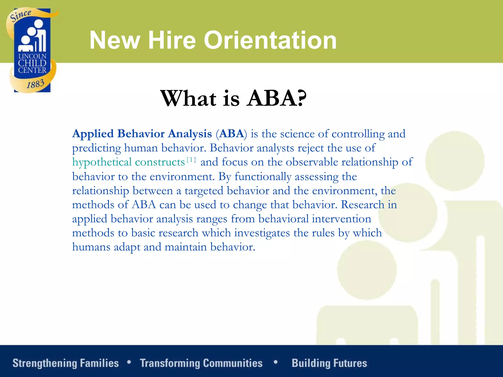 The document provides an overview of applied behavioral analysis (ABA) as presented in a new hire orientation. It defines ABA as using scientific methods to study and change socially significant behaviors by understanding their relationships to environmental factors. The orientation covers ABA principles and techniques including reinforcement, prompting, measuring behaviors, respondent conditioning, and emphasizing positive interventions over punishment. It also discusses creating environments that promote appropriate behaviors and make problem behaviors irrelevant, inefficient or ineffective.