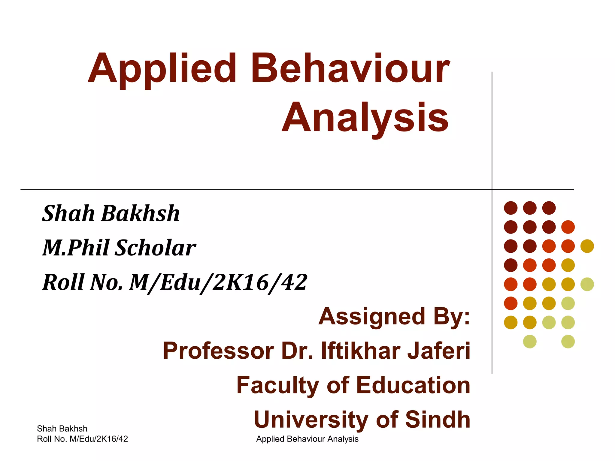 Applied Behavior Analysis (ABA) is a scientific approach for improving behaviors. It originated in the 1960s from researchers at the University of Kansas who applied principles of learning theory to address social problems. Key figures in early ABA research include Ivar Lovaas, who pioneered ABA methods for autism. Core ABA concepts include positive and negative reinforcement, differential reinforcement of alternative behaviors to reduce undesired behaviors, and understanding the function of behaviors. ABA uses techniques like shaping, chaining, and collecting ABC (antecedent-behavior-consequence) data to develop effective behavior change programs.