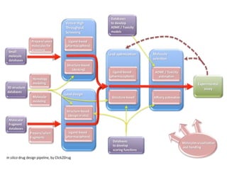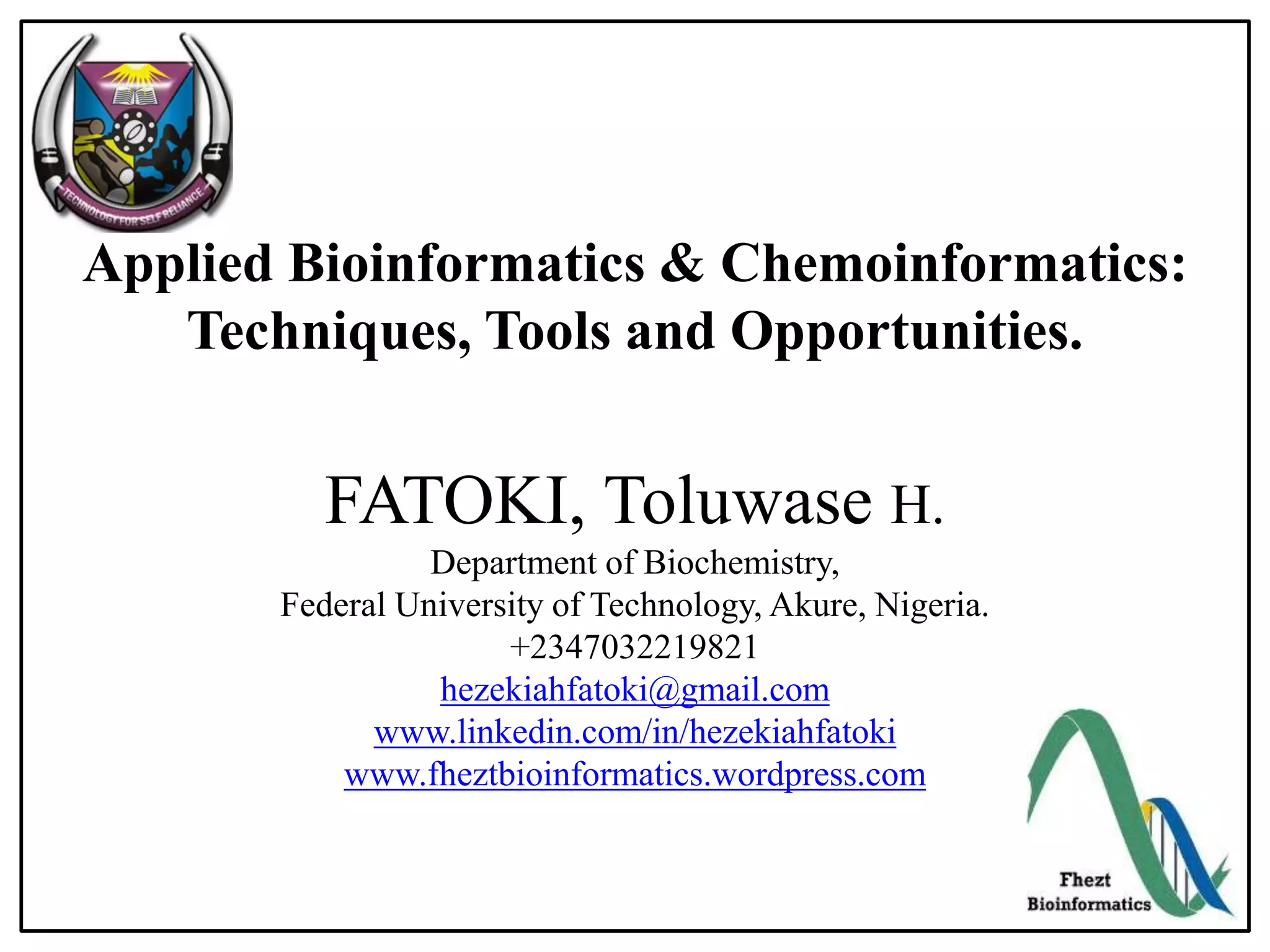 The document presents an overview of bioinformatics and cheminformatics, detailing techniques, tools, and opportunities in the field. It covers topics such as genetic engineering, sequencing, and applications in biotechnology and biopharmaceutical industries, along with current trends and career opportunities. Key resources and databases for bioinformatics are also provided.