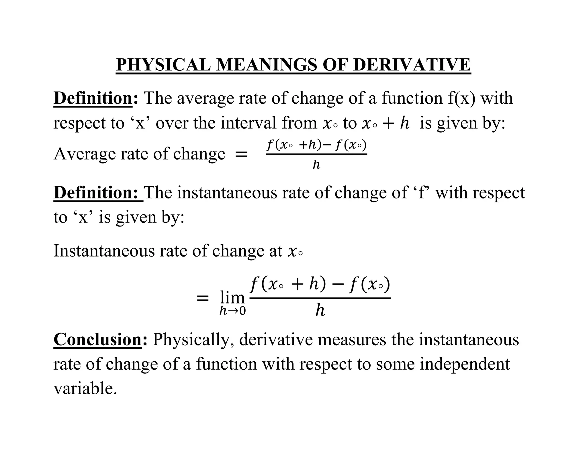 The document discusses the physical meanings of derivatives, explaining average and instantaneous rates of change using calculus concepts. It includes various examples related to free fall, projectile motion, and marginal analysis in business, illustrating how derivatives apply to real-world situations. Additionally, it examines body motion on a coordinate line, calculating displacement, velocity, and changes in direction.