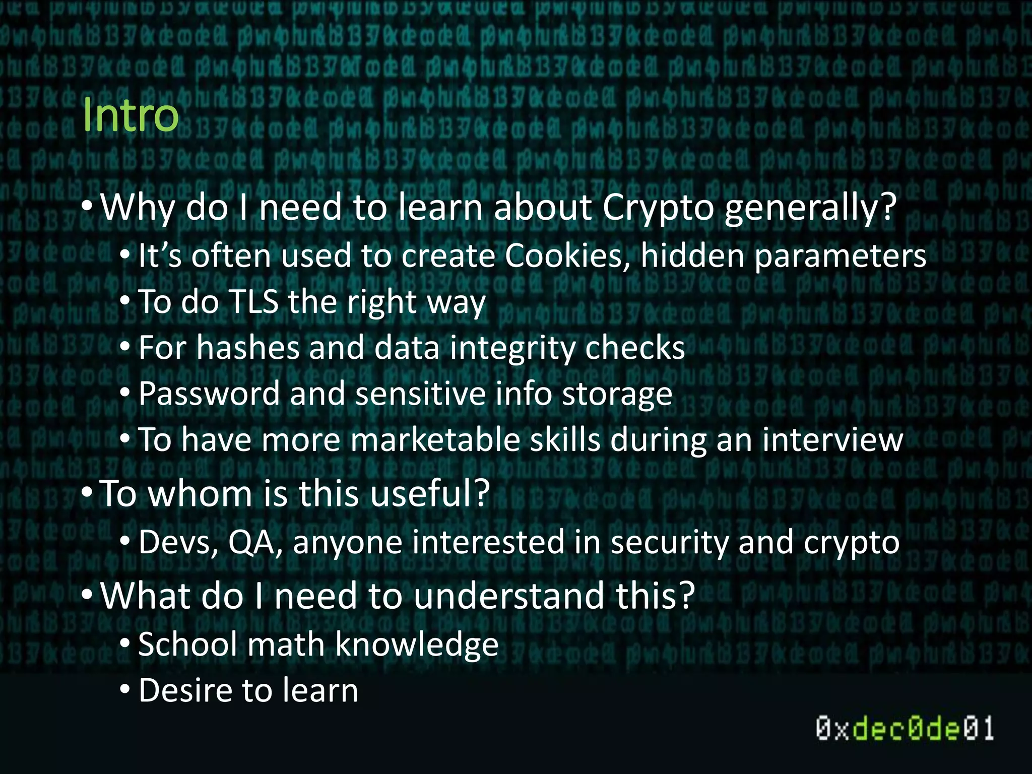 The document discusses the importance of understanding cryptography, particularly symmetric encryption and stream ciphers, detailing the methods of encryption and potential vulnerabilities such as key reuse and bit flipping. It emphasizes the necessity of using well-known cryptographic solutions instead of creating custom methods and highlights the significance of using secure random number generators for initialization vectors. Ultimately, it advocates for following best practices in cryptography to ensure data security.