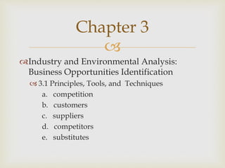 This document outlines chapters from a book on industry and environmental analysis for business opportunity identification. Chapter 3 discusses principles and techniques for analyzing competition, customers, suppliers, competitors and substitutes. It also examines types of industries like agribusiness, manufacturing, retail, services and international trade. Chapter 3 concludes by covering the identification of business opportunities. Chapter 4 examines the socioeconomic impact of businesses on consumers, suppliers, investors, government, households and international trade.