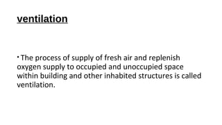 1. The document discusses different types of ventilation systems including natural ventilation and mechanical ventilation.