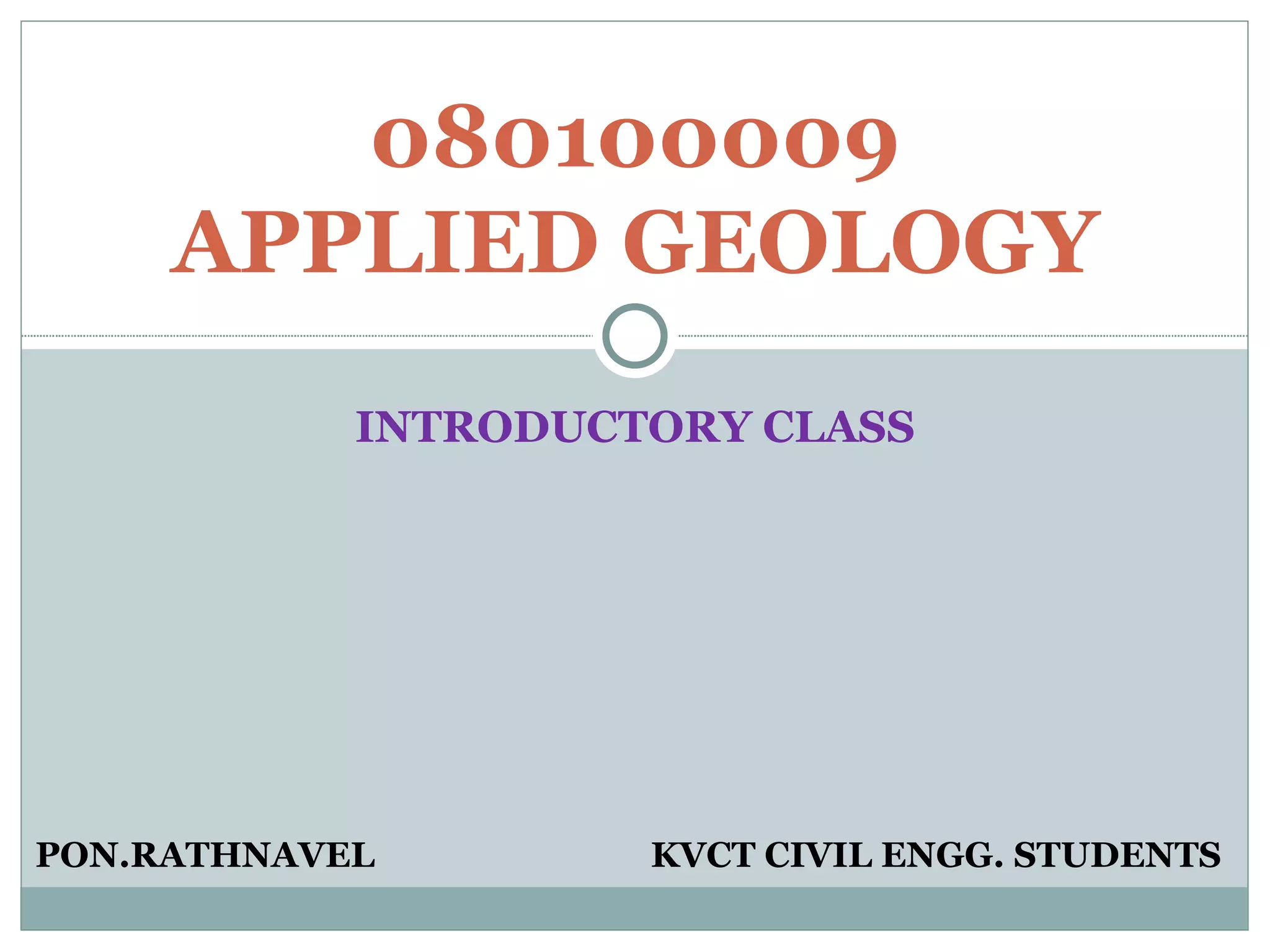 This document outlines an introductory geology course for civil engineering students. It introduces geology and explains why it is important for students to learn. The document then outlines the course syllabus which covers 5 units on topics like mineralogy, petrology, structural geology, and geological investigations for civil engineering projects. It also provides the lesson plan, names course captains, and describes the evaluation scheme which includes internal and external assessments.