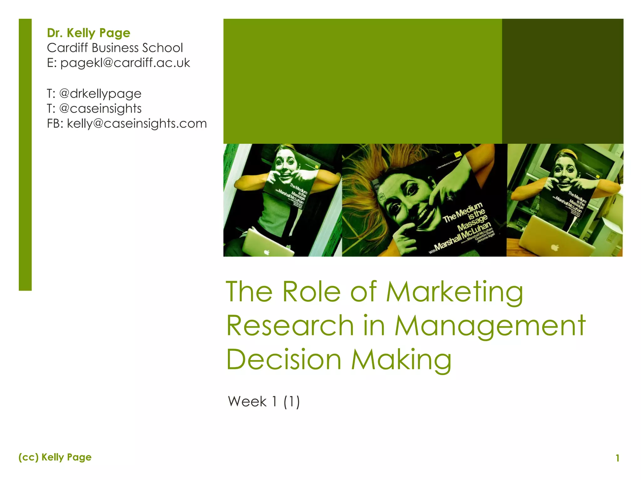 The document discusses the role of marketing research in management decision-making, including its definition and importance within the marketing process. It outlines types of research studies, reasons for conducting or not conducting research, and the historical development of marketing research. The lecture aims to enhance understanding of the marketing environment, the value of research, and the decision-making framework for marketing managers.