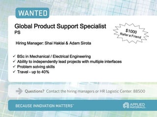 The document describes several job openings at a company. The positions include an Application Engineer, Global Product Support Specialist, UVision PS, IE - Industrial Engineer, Physics Student, Algorithms Team Leader / Group Manager, Spares Senior NPI planner, Application Develop Integrative Solutions, System Engineer for SEM DR, OI System Design Engineer, Matlab Developer, and Mechanical Engineer. The roles involve responsibilities such as customer support, project management, research, and engineering. Requirements include an engineering or physics background and skills in areas like communication, problem solving, and programming.