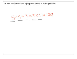 There are 5 people that can be seated in a straight line. This can be calculated using permutations, which is 5P1 = 5 ways. Six students can be seated in 8 vacant seats in 8P6 = 20160 ways. The document provides examples of calculating permutations and factorials to determine the number of possible arrangements or combinations of objects.