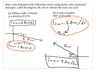 This document provides instructions to summarize five vectors problems by drawing scale diagrams labeling the vectors, scales, and calculations. The problems include a person walking, a boat traveling at an angle, an ultralite plane with wind resistance, two people kicking a soccer ball at angles, and an aircraft with wind resistance. Students are to solve for the resultant vectors and directions in each case.
