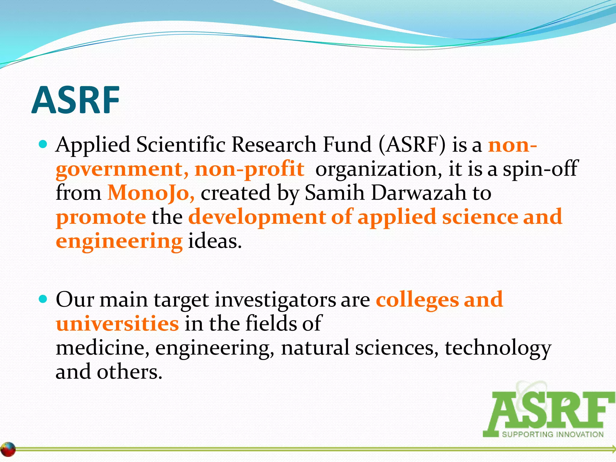 The Applied Scientific Research Fund (ASRF) is a non-profit organization aimed at promoting applied science and engineering innovations through funding for researchers in Jordan. It offers three main funding schemes: Samih Darwazah Innovation Grants, Proof of Concept, and Student Competitions, supporting projects from material development to commercialization while retaining intellectual property rights as per agreements. ASRF focuses on specific themes like renewable energy and pharmaceutical research, and emphasizes adherence to ethical principles in research activities.