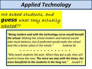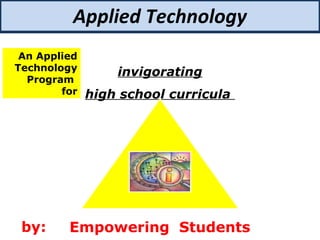 The document outlines an applied technology program designed to modernize high school curricula by focusing on current technologies and student interests. It emphasizes a student-centered approach, with specific goals for each semester that include exploring various technologies, refining skills, and developing career options. The program aims to empower students by providing them with relevant skills and experiences to prepare for future employment opportunities.