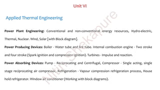 The document discusses applied thermal engineering including power plant engineering, types of boilers, and internal and external combustion engines. It covers the principles of steam production, boiler classifications, types of turbines, and the working mechanisms of both four-stroke and two-stroke engines. Additionally, it includes comparisons between water tube and fire tube boilers, as well as between internal combustion engines and their classifications based on various criteria.