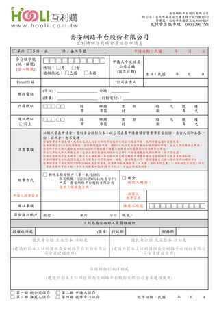 總公司:台北市南港區忠孝東路六段21號12F-7 營業處:台北市南港區玉成街89號1F 免付費客服專線:0800-299-788 喬安網路平台股份有限公司 互利購網路商城會員經營申請書 □單件 □多件,共______ 件 / 本件序號 _________ 申請日期:民國 年 月 日 身分證字號 (統一編號) □□□□□□□□□□ 申請人中文姓名 性別: □男 □女 (公司名稱 [登入帳號] 婚姻狀況: □已婚 □未婚 /設立日期) 生日:民國 年 月 日 Email信箱 公司負責人 (市話):____________________ 分機:_________ 聯絡電話 (傳真):____________________ (行動電話):________________________ 戶籍地址 □□□-□□ 縣 鄉鎮 里 鄰 路 段 號 樓 市 市區 村 衡 弄 之 通訊地址 □□□-□□ 縣 鄉鎮 里 鄰 路 段 號 樓 □同上 市 市區 村 衡 弄 之 以個人名義申請者,需附身分證影印本;以公司名義申請者須付營業事業登記證、負責人影印本各一 份,缺件者,恕不受理。 ※當簽署本申請書時,代表您已正式向喬安網路平台股份有限公司提出申請,我們將儘速通知審查結果。 ※為保障您有7日合約審閱權,若於期間退出申請,請於7日內以書面或傳真通知我們解除申請,且永久不得再提出申請。 注意事項 ※您所申請之個人通訊電話與E-mail將同意授權予推薦人或推薦人所屬推薦人作為聯繫之用途。 ※本次申請收取之所有文件(包含未來可能增補或附加之資料)不論通過審核或解除申請,皆不予退還。 ※指定匯款帳戶若為非第一銀行之金融機構,每次匯款所需跨行轉帳手續費授權由喬安網路平台自會員款項扣除。 ※互利購前後台帳號預設為上表所填身分證字號或統一編號,密碼為後六碼,請開通後自行登入修改密碼以確保安全。 ※申請營業卡者需繳交NTD$ 2,000成為營業會員, 該費用為系統服務費、工本費、資料及訊息費,一旦繳納恕不退還。該營 業會員需於申請日起一年內有效推薦四張(含)營業卡以上,方能註冊成為網商。 □ 轉帳至指定帳戶:第一銀行(007) 指定帳號:152-10-200524 (延吉分行) □ 現金 繳費方式 戶名:喬安網路平台股份有限公司 收款人親簽: 匯款人帳號後五碼: 推薦人 申請人親筆簽名 親筆簽名 備註事項 推薦人帳號 □□□□□□□□□□ 獎金匯款帳戶 銀行: 銀行 分行 帳號: 下列為喬安內部人員簽核欄位 授權收件處 (簽章) 行政部 財務部 國民身分證 正面影本 浮貼處 國民身分證 反面影本 浮貼處 (建議於影本上註明僅供喬安網路平台股份有限公 (建議於影本上註明僅供喬安網路平台股份有限公 司會員建檔使用) 司會員建檔使用) 存摺封面影本浮貼處 (建議於影本上註明僅供喬安網路平台股份有限公司會員建檔使用) □ 第一聯 總公司保存 □ 第二聯 申請人保存 □ 第三聯 推薦人保存 □ 第四聯 收件中心保存 收件日期:民國 年 月 日