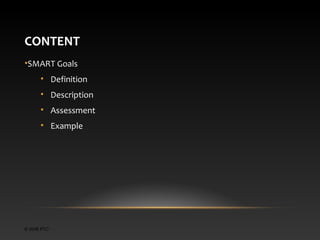 The document discusses applying SMART goals to career management. It defines what a SMART goal is - specific, measurable, achievable, relevant, and timely. It then provides details on each component of a SMART goal, including definitions, descriptions, and examples. It also includes an assessment template and examples of general goals versus SMART goals to illustrate how to write effective SMART goals.