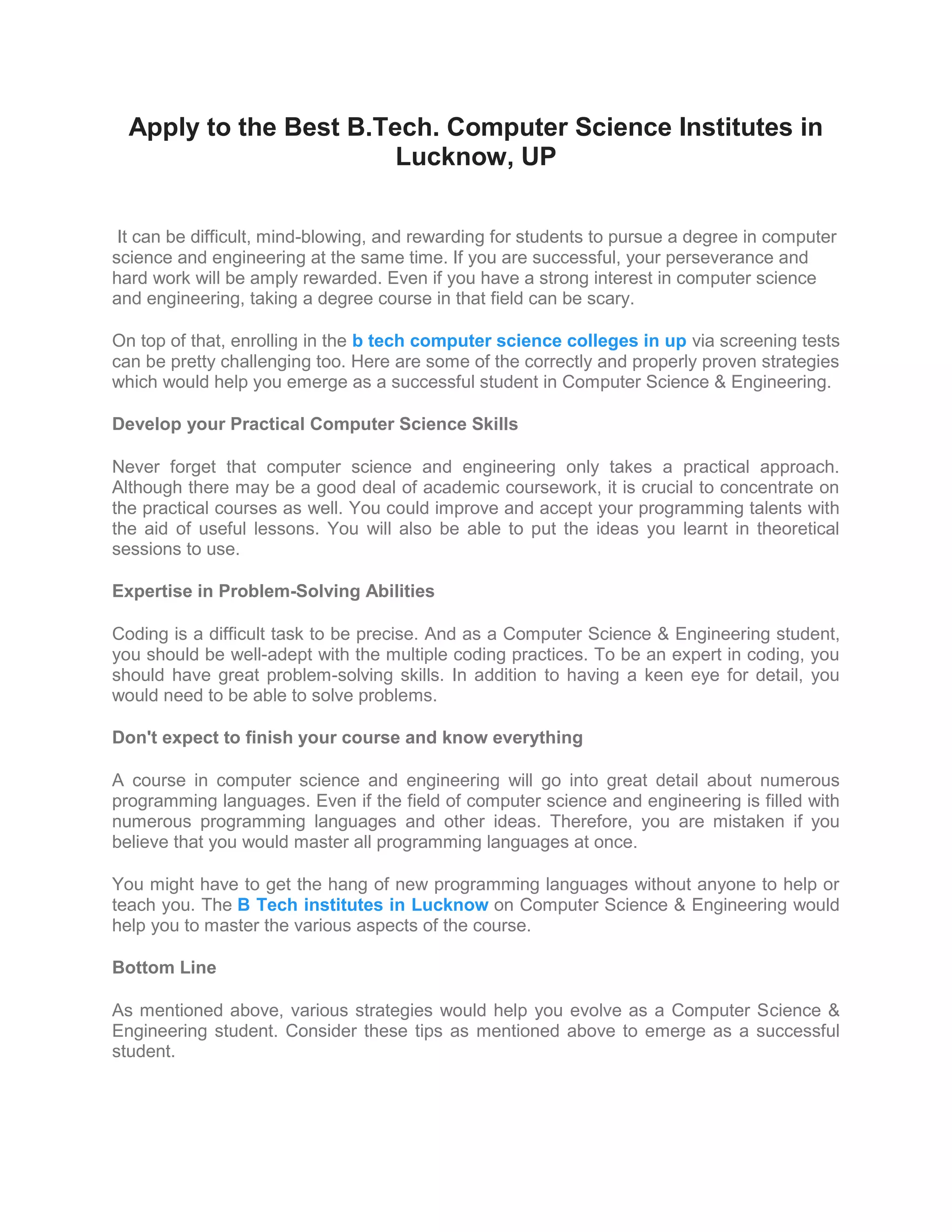 On top of that, enrolling in the b tech computer science colleges in up via screening tests can be pretty challenging too. Here are some of the correctly and properly proven strategies which would help you emerge as a successful student in Computer Science & Engineering.
