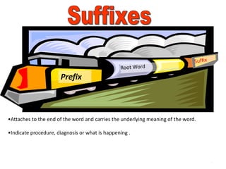Suffixes are added to the end of words to change their meaning. Common medical suffixes like -itis indicate inflammation, -osis refers to a condition or disease, and -pathy relates to disease. Terms ending in -ology relate to the study of something, while -ectomy means the surgical removal of something.