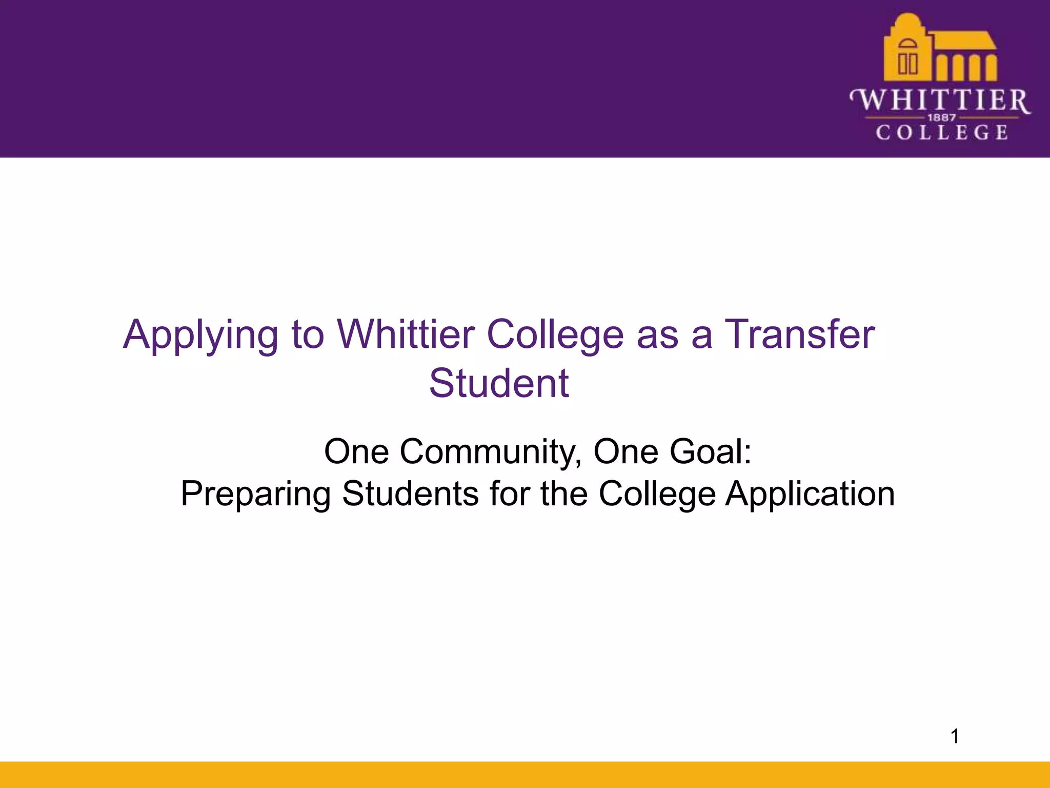 Whittier College is a four-year independent liberal arts college located in California that was founded in 1887. It has a diverse student body of around 1,500 students and offers 31 majors across 23 disciplines. The college emphasizes a Quaker foundation of valuing diversity and community through quality education in small classes. It costs around $35,782 per year for tuition and fees plus $10,026 for room and board, though 85% of students receive financial aid averaging $25,055. Transfer students with a GPA of 3.0 or higher are eligible for merit scholarships from $10,500 to $13,500. The application process involves common applications with essays and letters of recommendation. Whittier prepares students