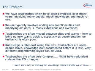 UML modeling is proposed to document complex testbenches, but it has limitations for representing aspect-oriented languages like e. Specifically, UML was designed for object-oriented systems while e uses units and structs, and e allows for richer extensions than AspectJ which UML tools support. While UML could represent portions of an e testbench, it does not fully capture e's aspect-oriented features or constraints. Therefore, UML may not be the best solution for comprehensive documentation of e testbenches.