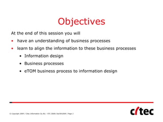The document discusses aligning information design with business processes. It provides an overview of business processes and defines information design as preparing information so people can use it efficiently and effectively. The document uses the example of eTOM telecom processes and how to organize information by process categories. Developing an information model based on business processes can provide quicker access to information and harmonization across information products.