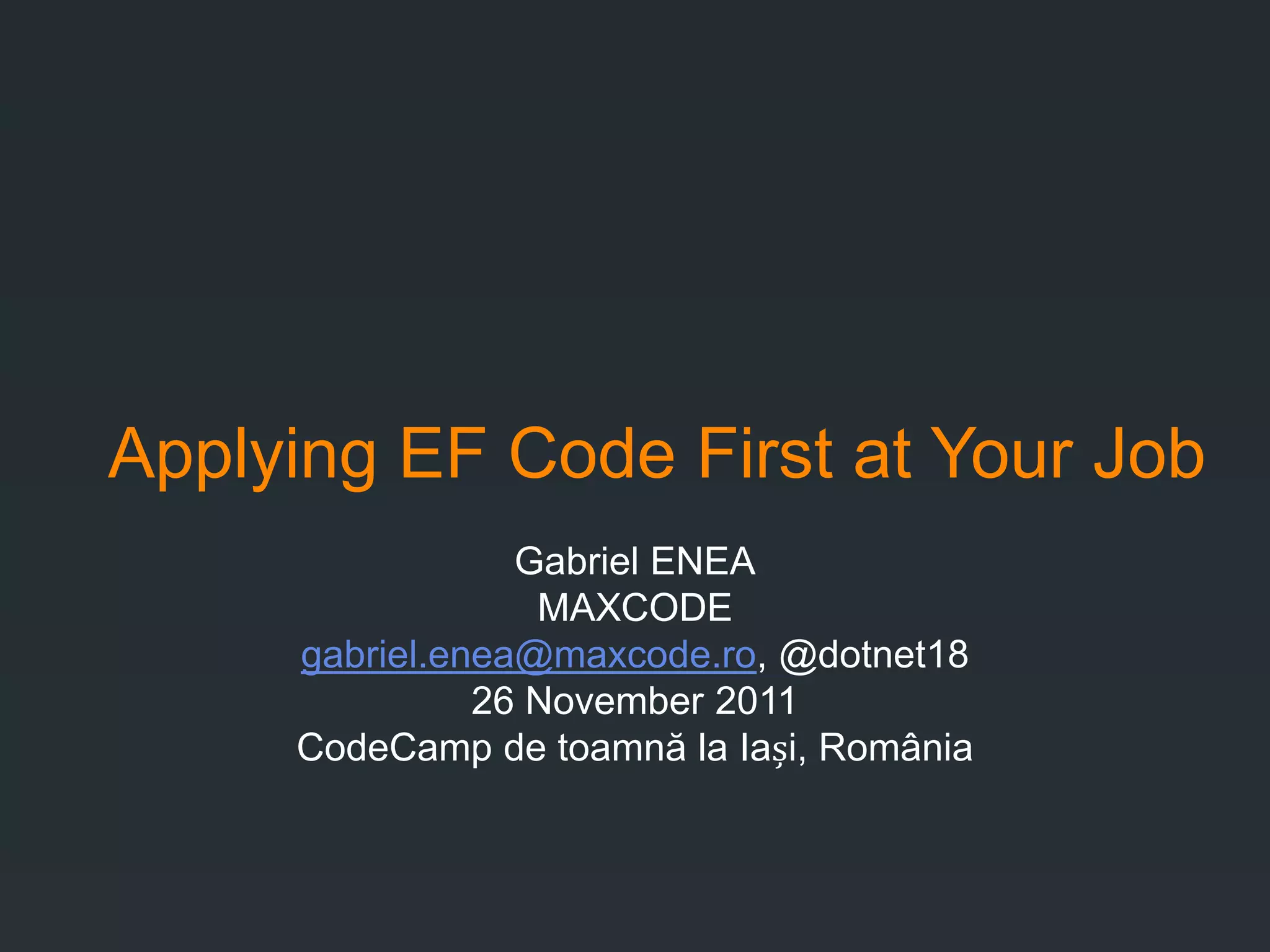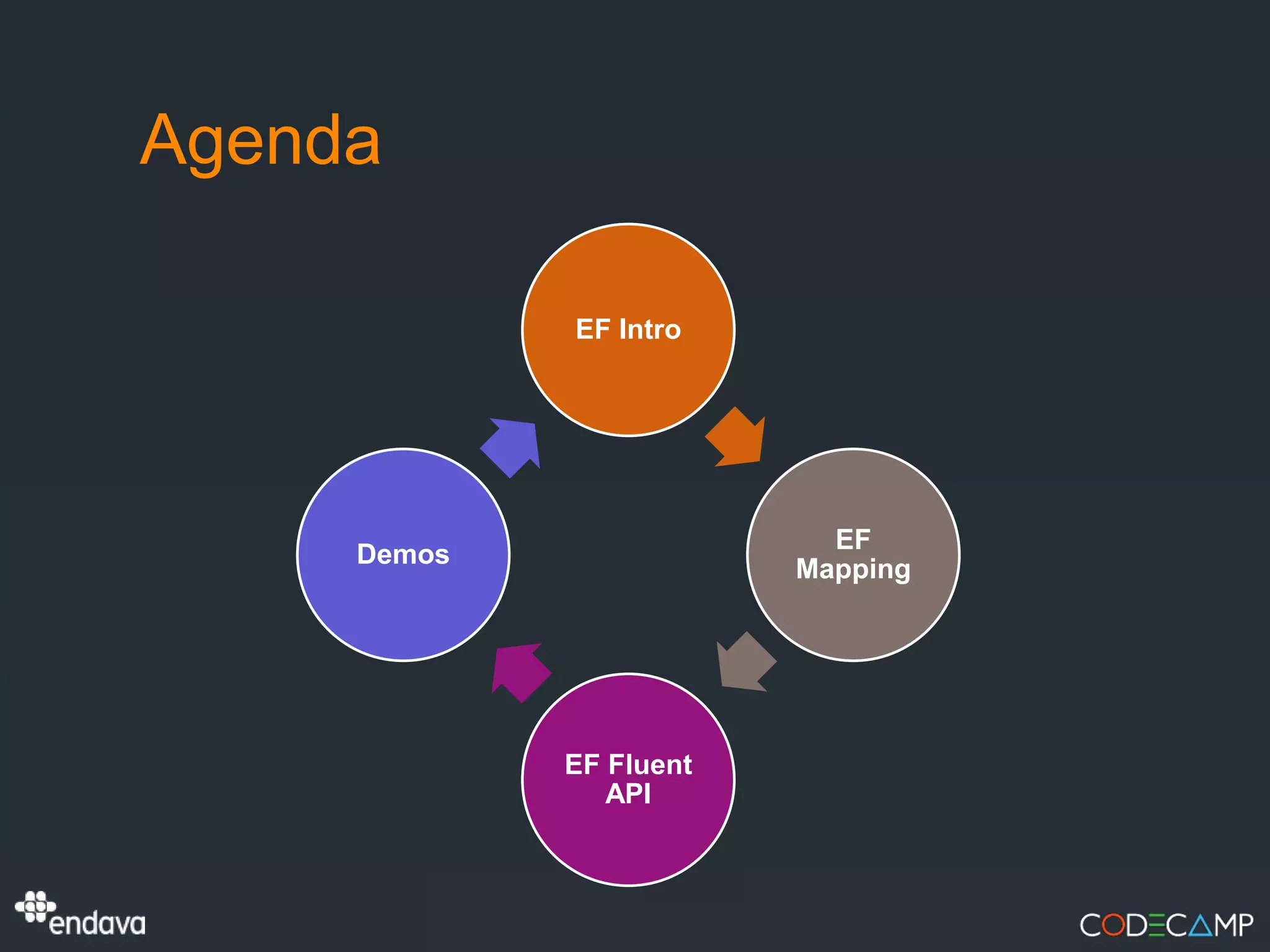 The document discusses the implementation of Entity Framework (EF) Code First approach in .NET applications, focusing on its features like Fluent API, data annotations, and context management. It includes various demonstrations using the Northwind database to illustrate advanced mapping configurations, change tracking, and relationships in EF. Additionally, it provides resources for further learning, including links to documentation and books on the topic.