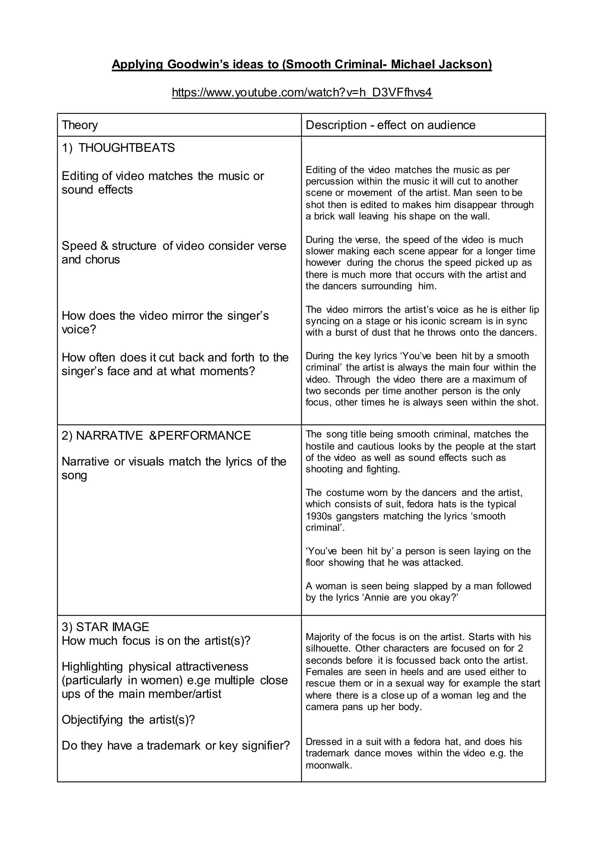 The music video for "Smooth Criminal" by Michael Jackson uses editing, choreography, costumes, and sounds to engage the audience. It cuts between scenes rhythmically and focuses on Jackson, highlighting his dancing skills. The 1930s gangster-style outfits and sounds of violence depict the song's narrative. Complex choreography and a surprising break in the music leave viewers wanting more.