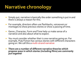 The document discusses various narrative theories and concepts that can be used to analyze film narratives, including: