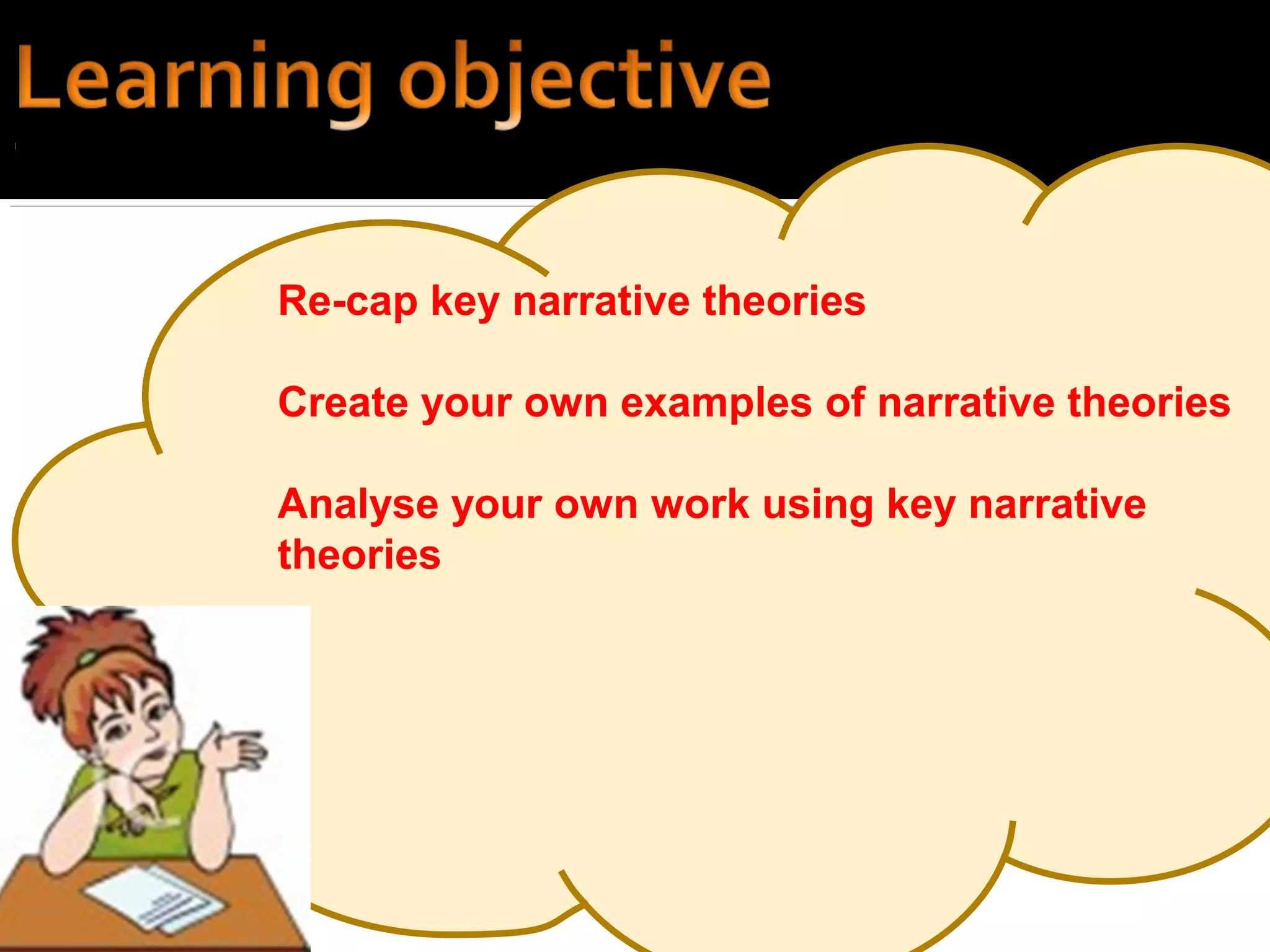 The document provides instructions for students to recap key narrative theories, create their own examples, analyze their own work using the theories, and post definitions, a storyboard illustrating each theory with creative camera work, and examples from their own work applying the theories to blogs. Students are also asked to review and analyze a high level response on applying the theories and give reasons for thinking it is high level.