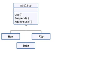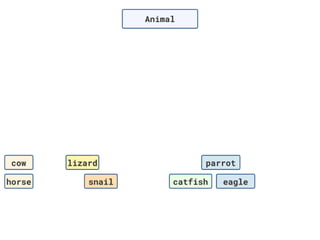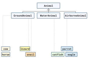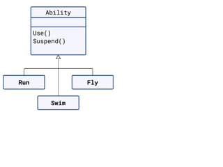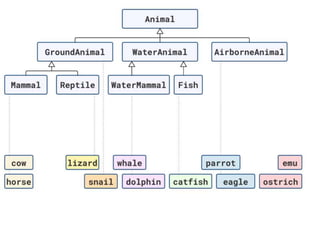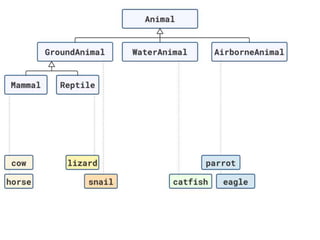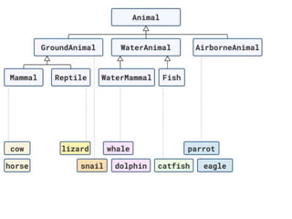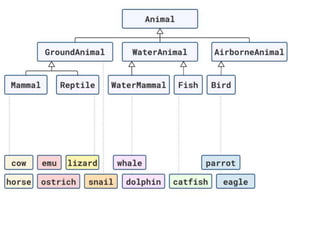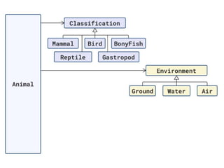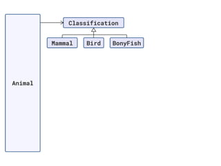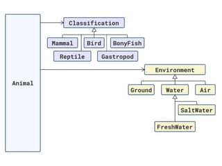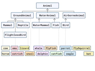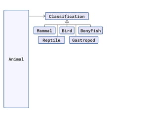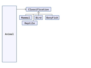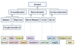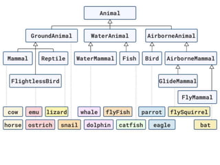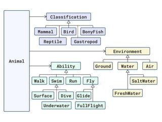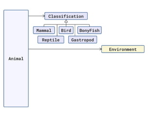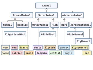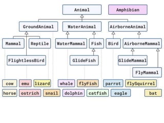 The document discusses applying object composition to create rich domain models, focusing on examples involving various animal classifications and their behaviors. It highlights the concept of logic duplication without true code duplication, illustrating how different animal types (mammals, water mammals, birds, etc.) can share behaviors in a structured way. Additionally, it provides links to a webinar for further exploration of the topic.