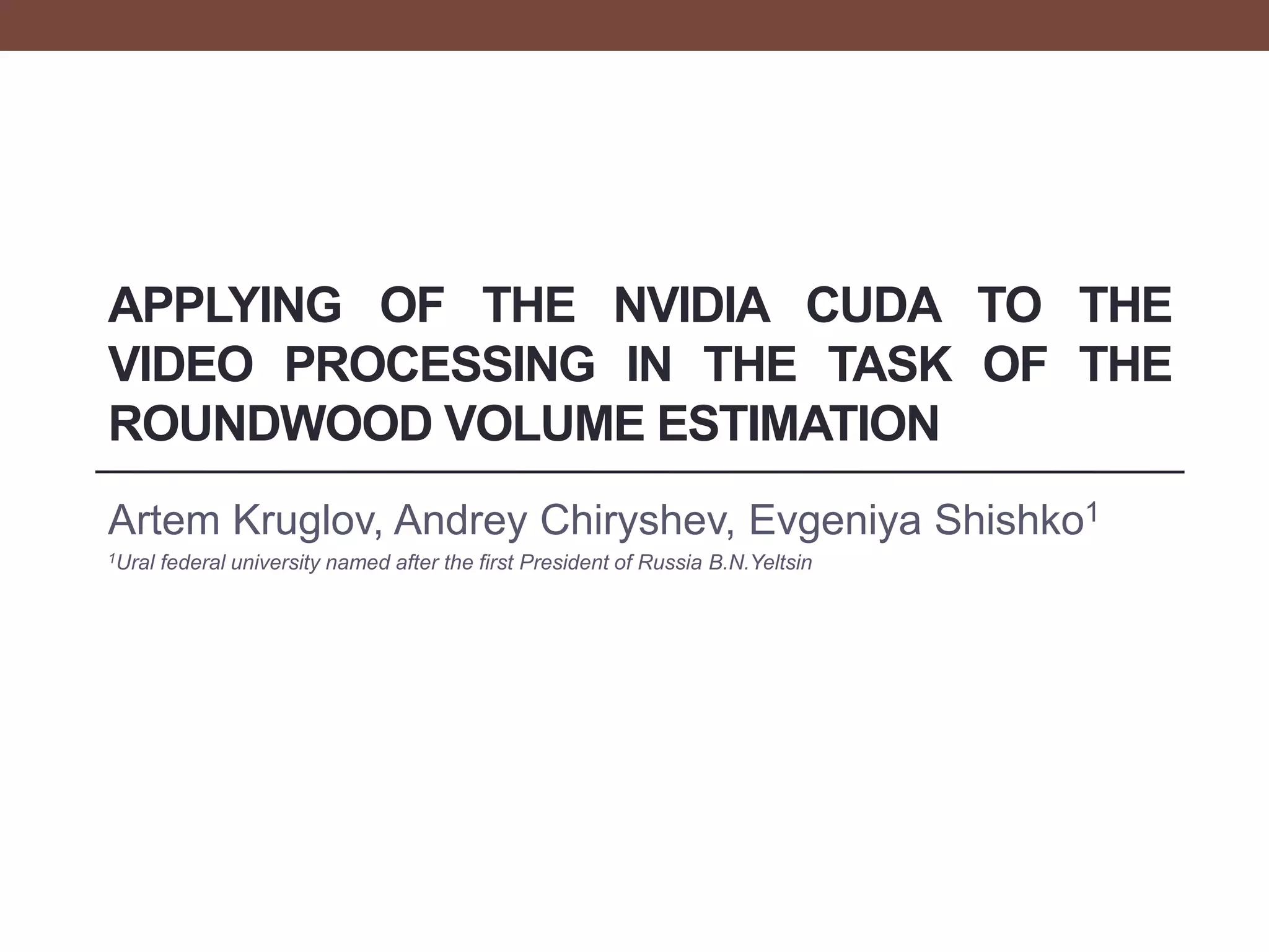 This document discusses the application of NVIDIA CUDA in video processing for estimating roundwood volume through machine vision. It highlights the system's ability to automate wood scanning, reduce errors compared to laser-based systems, and conduct real-time log detection within a 20 ms frame limit. The results indicate that the CUDA implementation achieves significant speedups, with average processing times suitable for real-time operations.