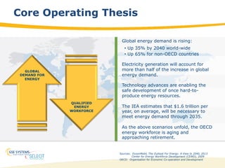 Global energy demand is projected to increase 35% by 2040, straining the supply of qualified energy workforce as many current workers approach retirement. New technologies enable production of harder to access energy resources but developing the trained workforce remains a barrier to meeting rising demand. Safety DNA analytics can enhance workforce processes from recruitment to development by evaluating individuals' propensity for safe behaviors based on cognitive and personality attributes. This helps improve safety culture, performance and outcomes by facilitating behavioral change at both the individual contributor and leadership levels.