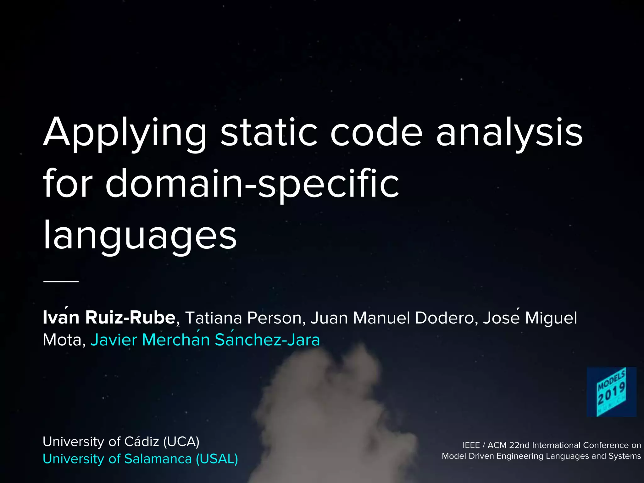 The document discusses applying static code analysis tools like SonarQube to analyze domain-specific languages (DSLs) developed using frameworks like Xtext. It presents a model-driven approach to automatically generate the code analyzers required by SonarQube from Xtext grammars. Case studies applying this to analyze algorithms in pseudocode and sheet music are described. Results found some correlation between manual and tool-based quality analysis, and musicians found the errors reported by the tool useful. Future work includes analyzing visual DSLs and model-driven development of augmented reality editors.