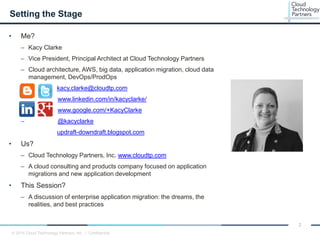 The document discusses the challenges and best practices for enterprise application migration to Amazon Web Services (AWS), highlighting the contrast between the traditional data center and cloud environments. It emphasizes the need for a systems thinking approach to address the complexities and risks of migration, indicating that not all applications are suited for a straightforward lift-and-shift strategy. Additionally, it provides insights into initial migration strategies and tools that can aid in facilitating the process effectively.