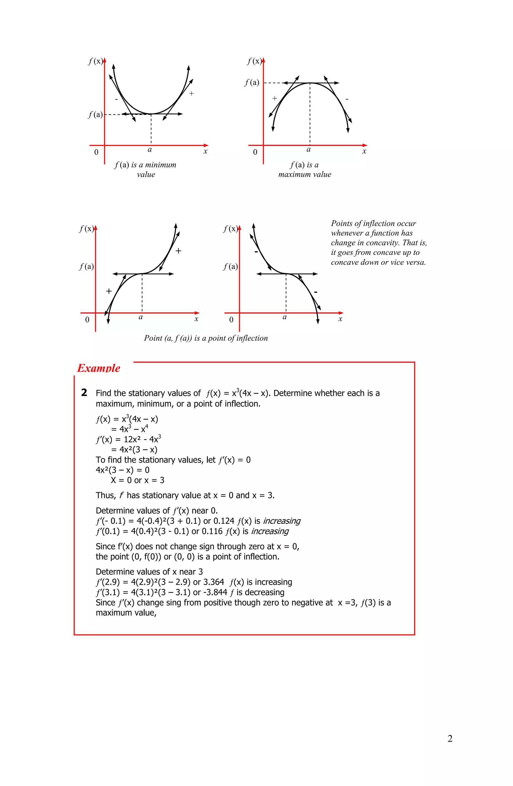 - Examples demonstrate finding stationary points, using the first and second derivative