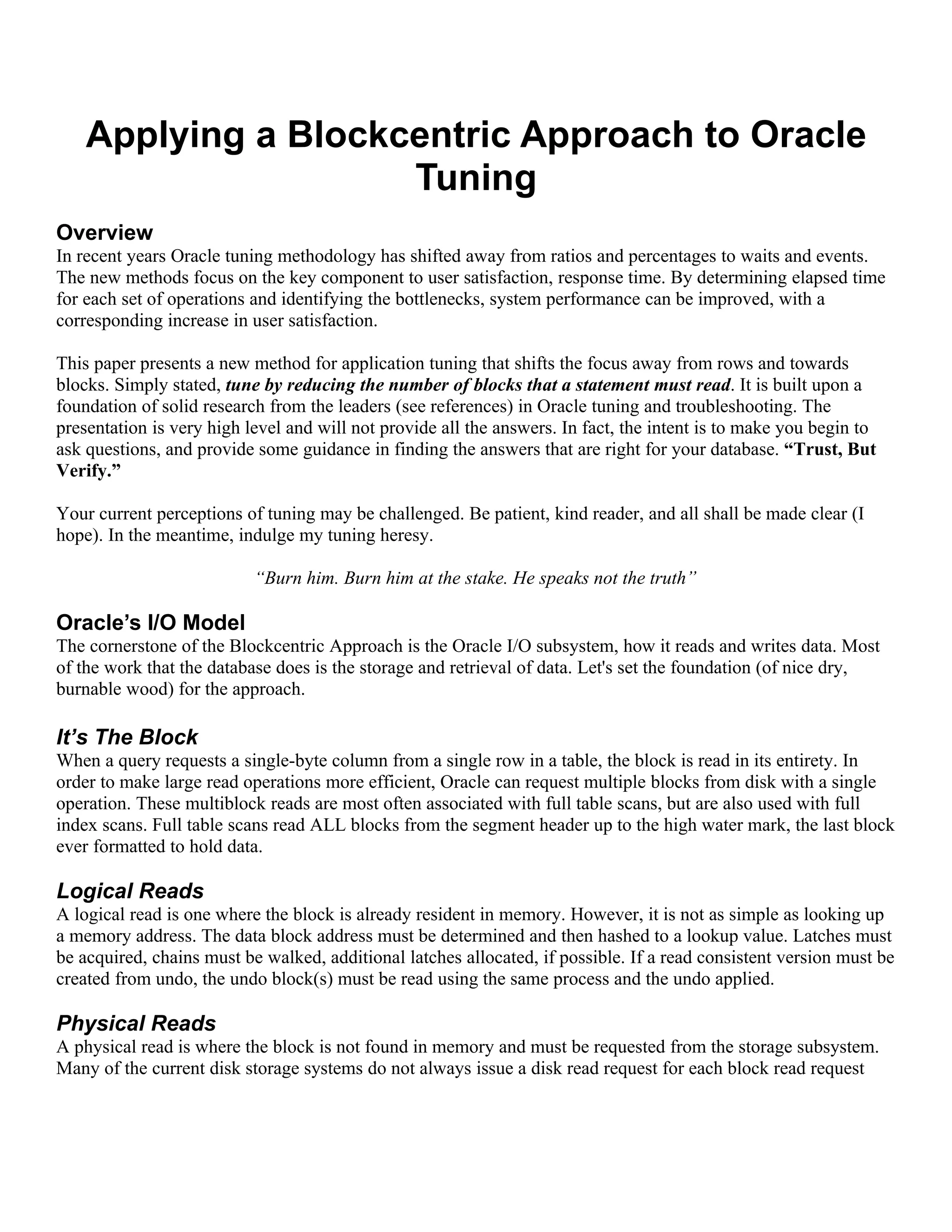 This document discusses a blockcentric approach to Oracle tuning, emphasizing the importance of reducing block reads rather than simply focusing on buffer cache hit ratios. It explores the nuances of physical and logical I/O operations, presenting a methodology for calculating resource consumption in terms of I/O operations to determine more efficient SQL statements. The paper also challenges traditional indexing rules and highlights the significance of block fragmentation and selectivity in optimizing database performance.