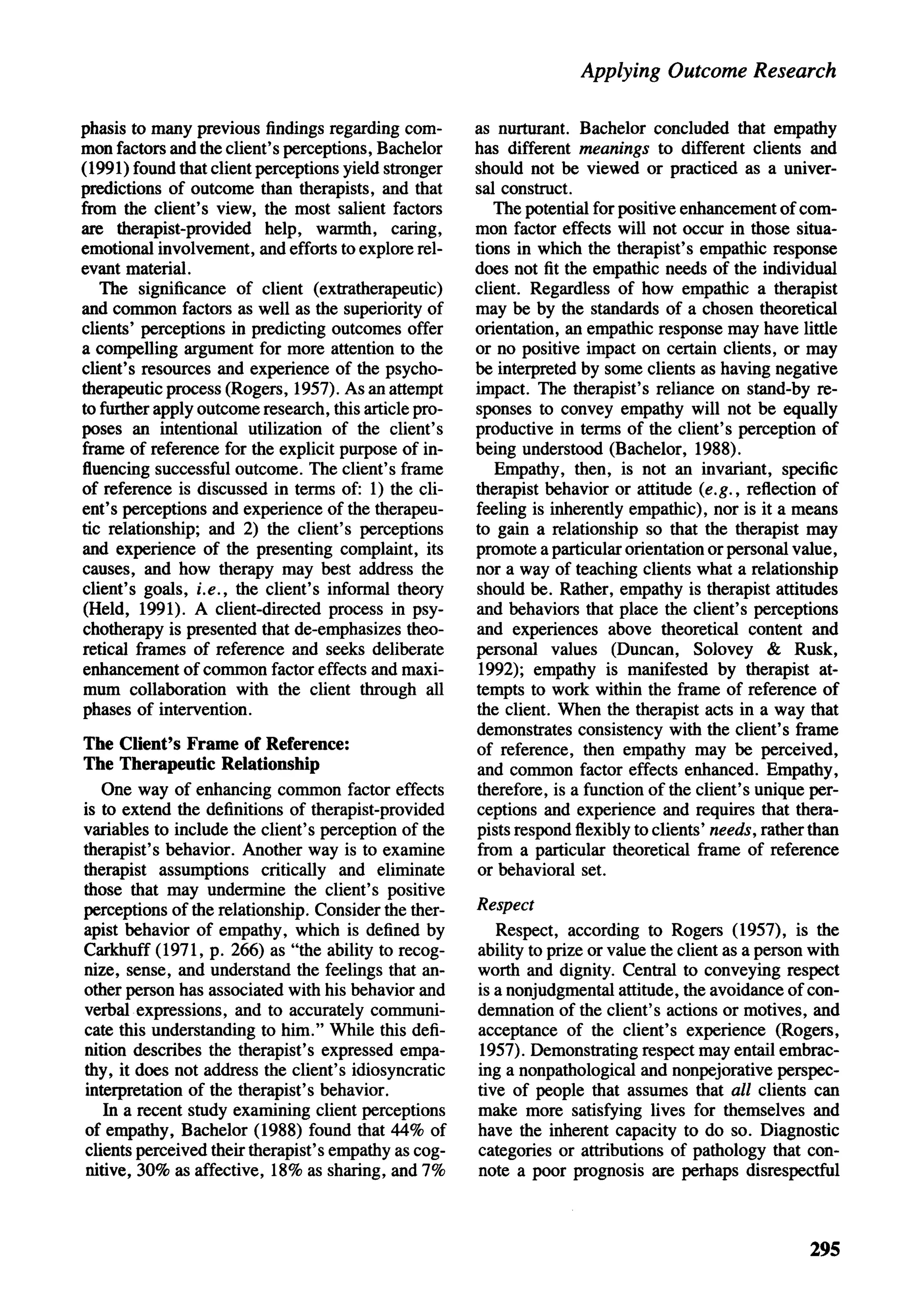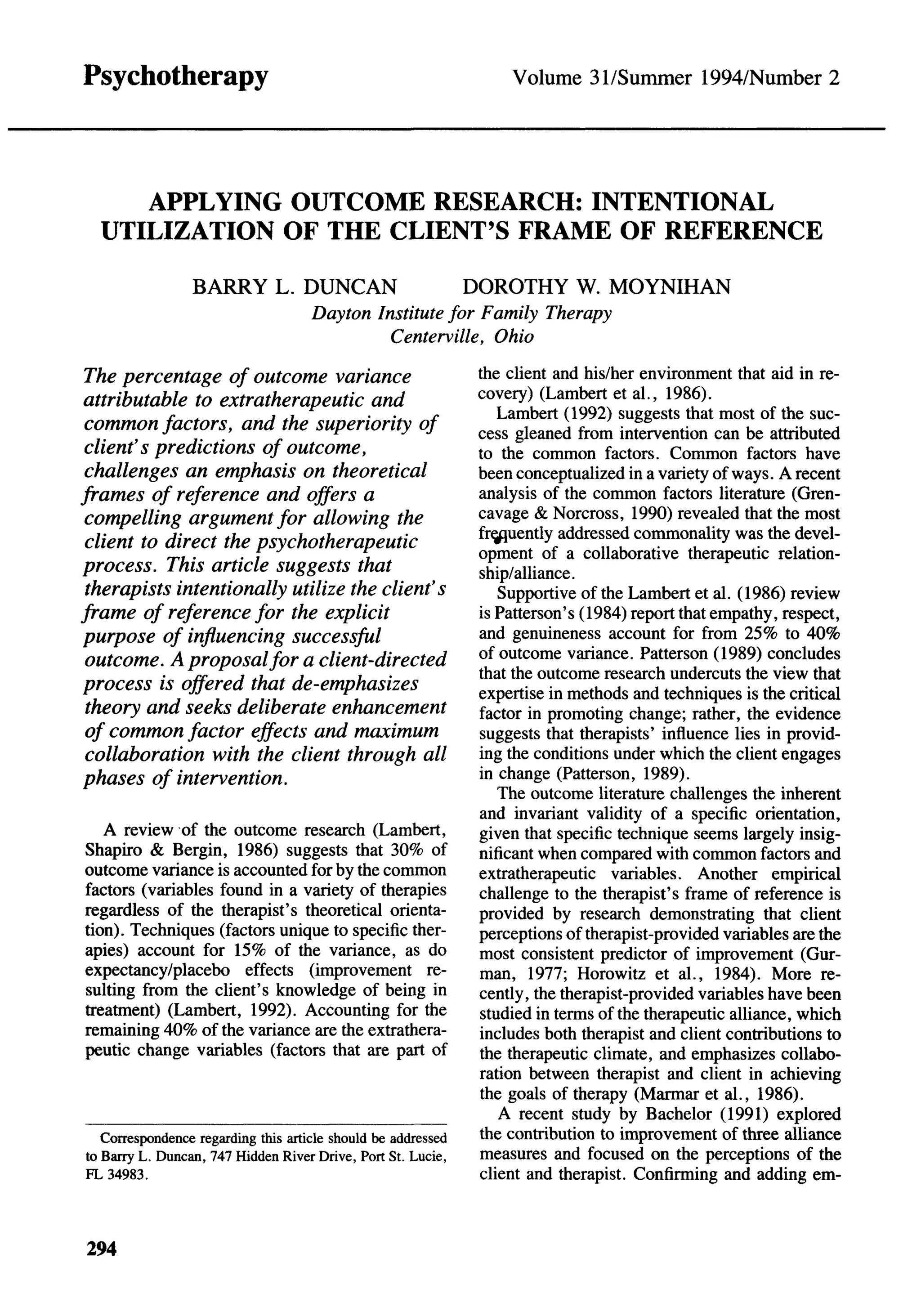 This article discusses applying research on psychotherapy outcomes, which has shown that common factors like the therapeutic relationship are more influential than theoretical approach or techniques. The article proposes intentionally using the client's frame of reference to enhance common factors and collaboration. It suggests emphasizing the client's perceptions of their relationship with the therapist and understanding of their issues over theoretical perspectives. A client-directed process is outlined that de-emphasizes theory and maximizes common factors and the client's involvement.