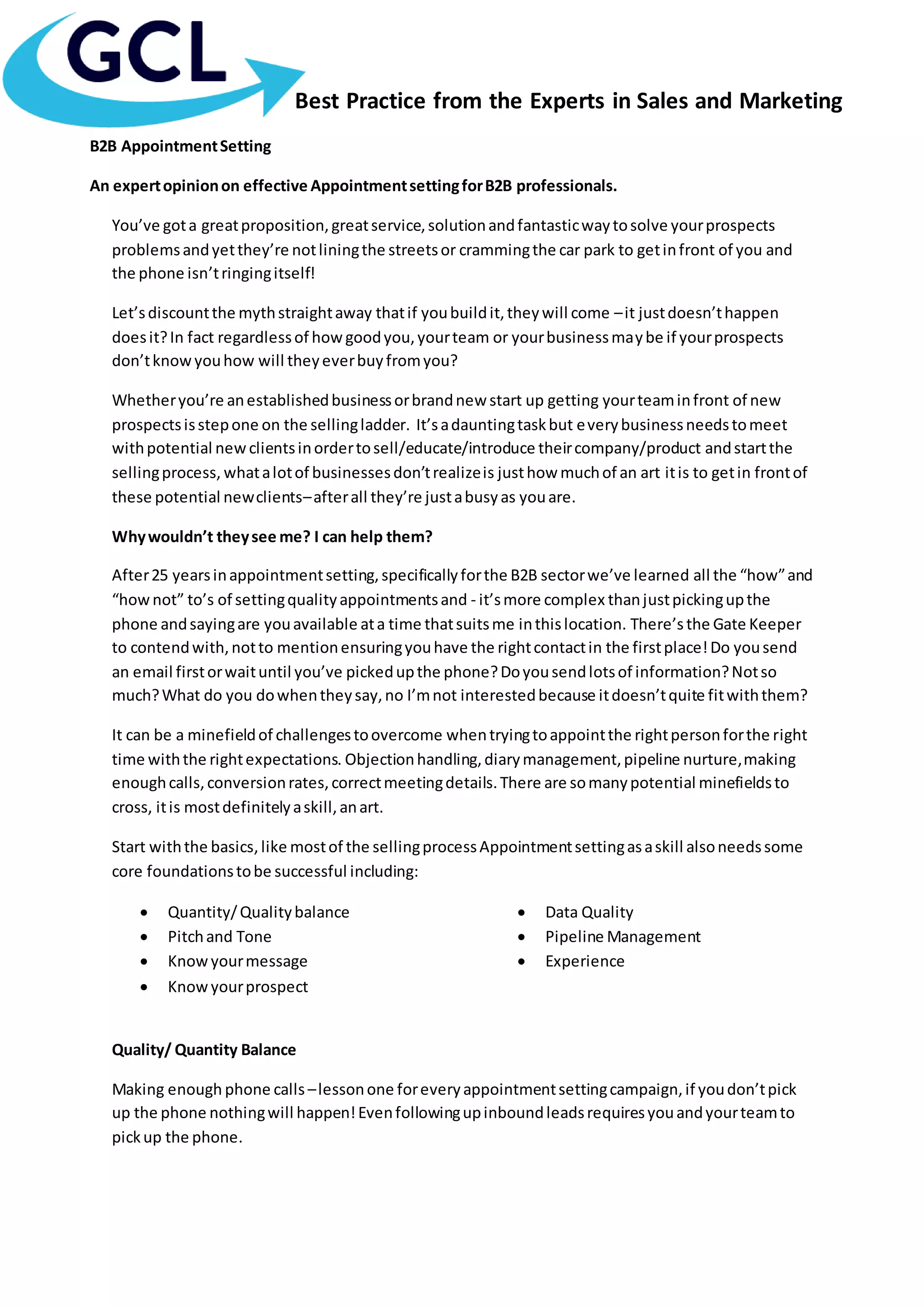 1) Effective appointment setting for B2B sales requires understanding that prospects are busy and may not immediately see the value in meeting without proper outreach.