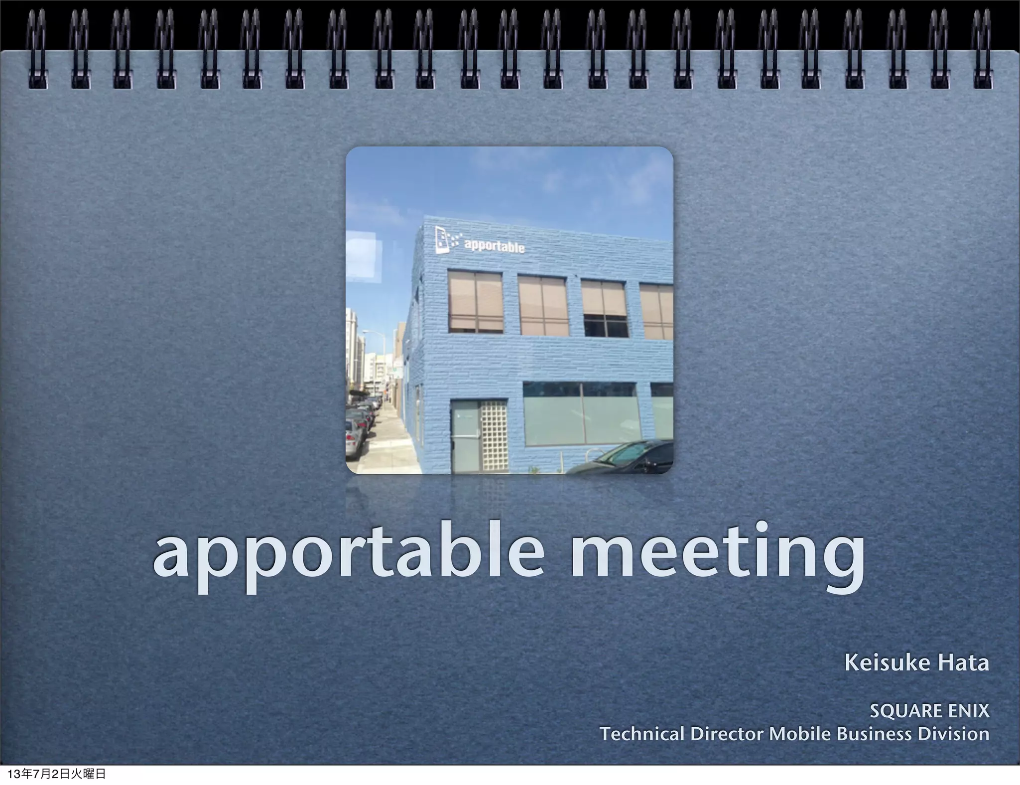 UIKitレベルなら )。これまで の案件は、50MB以上のタイトルが多かったためこのサイズが問題になることは少なかった模 様。しかし、デバッグビルドは非常に大きくなりがちなので気をつけること。 ●バイナリサイズが50MBを超える場合 androidのAPK Expansion Fileには対応しているため、詳しくは、Contact Usで問い合わせを してくださいとのこと。 Q:apportableを適用した場合のバイナリサイズはどの程度になるか?日本のソーシャルゲームを代 表とするアプリケーションは、50MB以下でランチャーとして機能させ、アセットデータは、サーバ ーからダウンロードしてくる仕組みを採用していることが多い。 13年7月2日火曜日