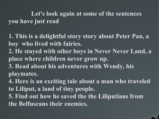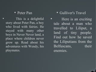 This document provides summaries of two stories: Peter Pan and Gulliver's Travels. The Peter Pan summary states that it is a story about a boy named Peter Pan who lives with fairies in a place called Never Never Land where children never grow up, and it describes his adventures there with Wendy. The Gulliver's Travels summary indicates that it is a tale about a man who travels to a land of tiny people called Liliputians and saves them from their enemies, the Belfuscans.