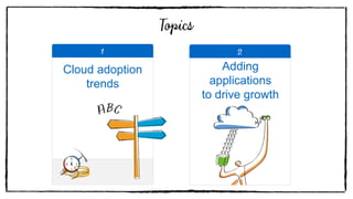 This document discusses trends in cloud adoption and provides examples of companies using cloud services. It notes that most companies are using cloud to streamline existing IT functionality or expand IT services. Examples are then given of companies in various industries using infrastructure as a service (IaaS), platform as a service (PaaS), and software as a service (SaaS) to deliver virtual desktops, backup and disaster recovery, telecommunications services, and analytics for internet of things devices.