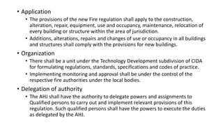 2. The Construction Industry Development Authority (CIDA) oversees regulating fire standards and local authorities implement and approve compliance.