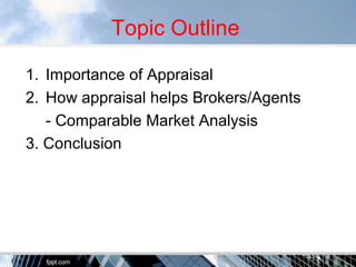 This document provides an overview of real estate appraisals. It defines appraisal as estimating the value of a property based on research and analysis of comparable properties. The document outlines the importance of appraisals for brokers and agents in determining market value. It also discusses the standards and approaches used in appraisals, including the market data, cost, and income approaches. Comparable market analyses and adjustments to comparable properties are explained. The conclusion emphasizes that appraisals provide accurate property valuations essential for the real estate profession.