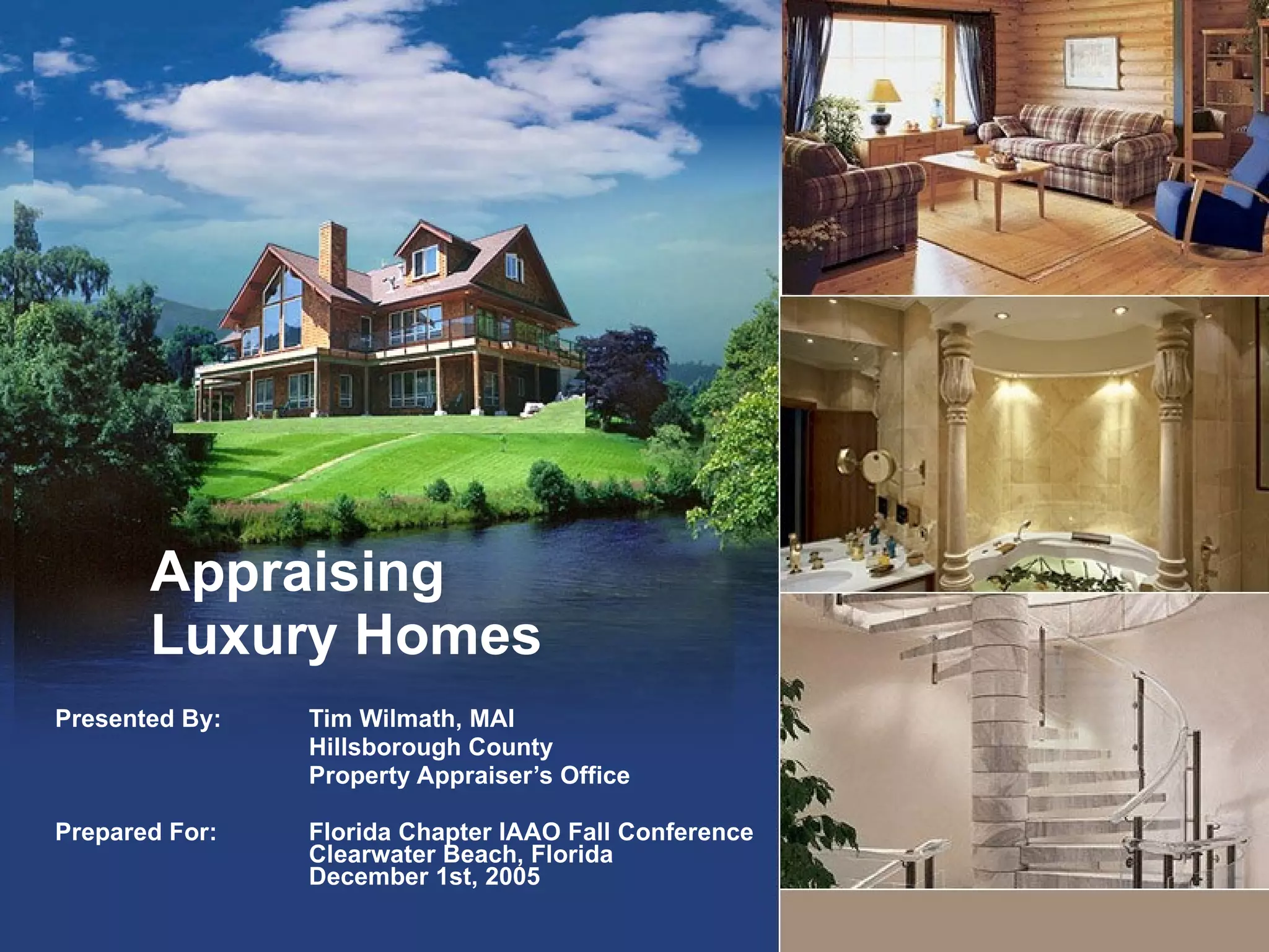 The document discusses appraising luxury homes. It provides statistics on luxury home sales in Florida, including that over 1,000 homes sold for over $1 million in 2004. The top counties for million dollar home sales are identified. Methods for appraising luxury homes are discussed, including the sales comparison, income, and cost approaches. Challenges with determining depreciation and functional or external obsolescence for luxury homes are addressed.
